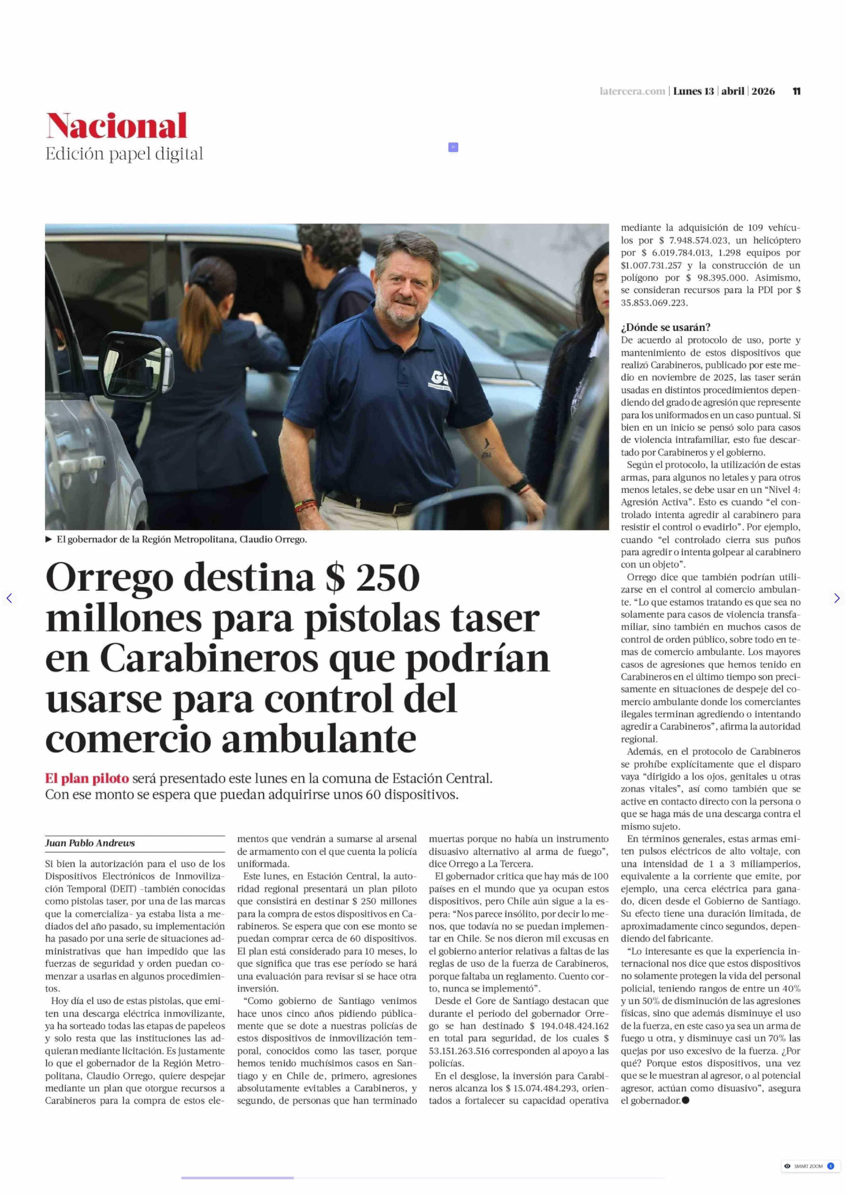 Orrego destina $ 250 millones para pistolas taser en Carabineros que podrían usarse para control del comercio ambulante 13-04-2026 La Tercera |