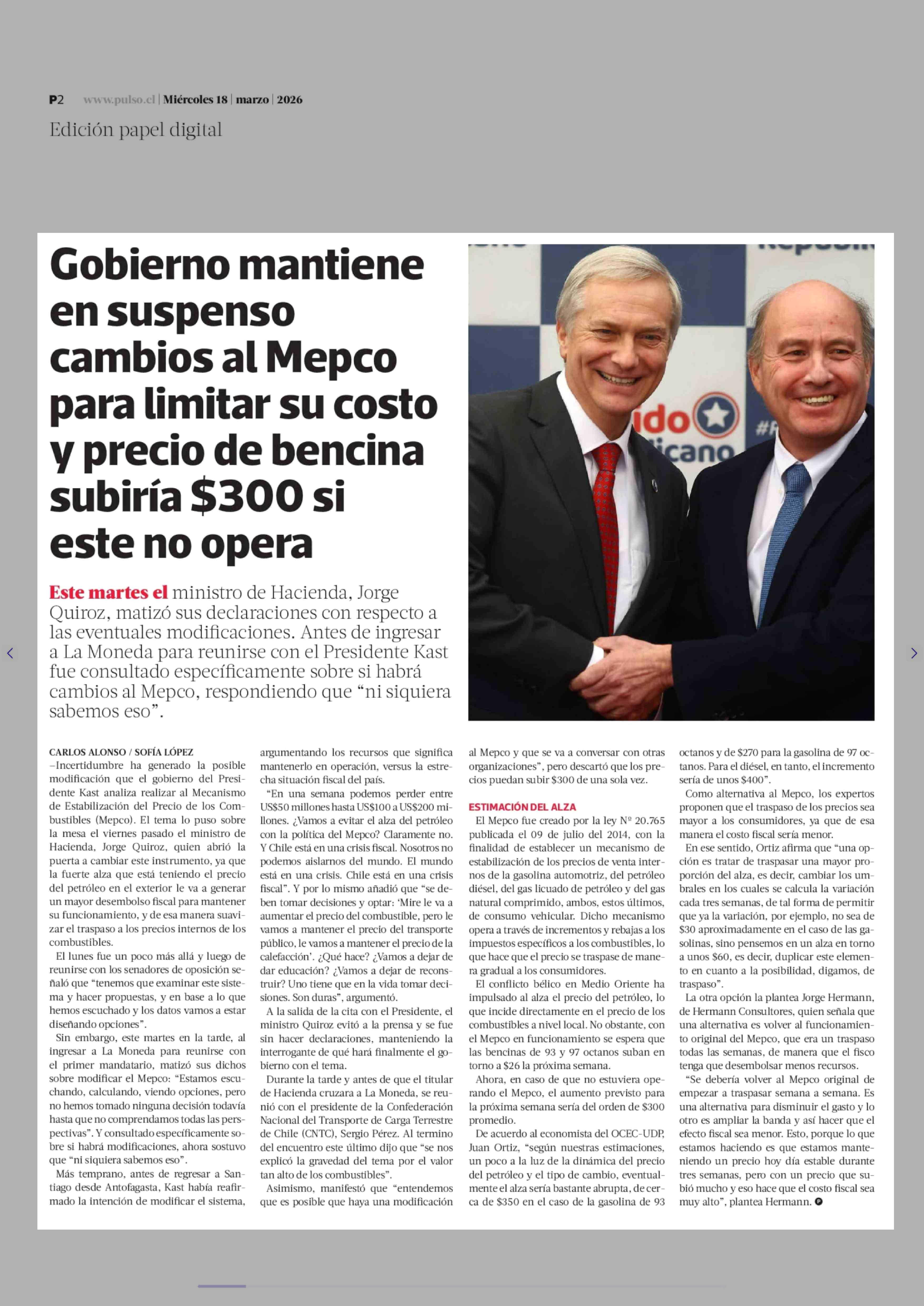 Título: Gobierno mantiene en suspenso cambios al Mepco para limitar su costo y precio de bencina subiría $300 si este no opera