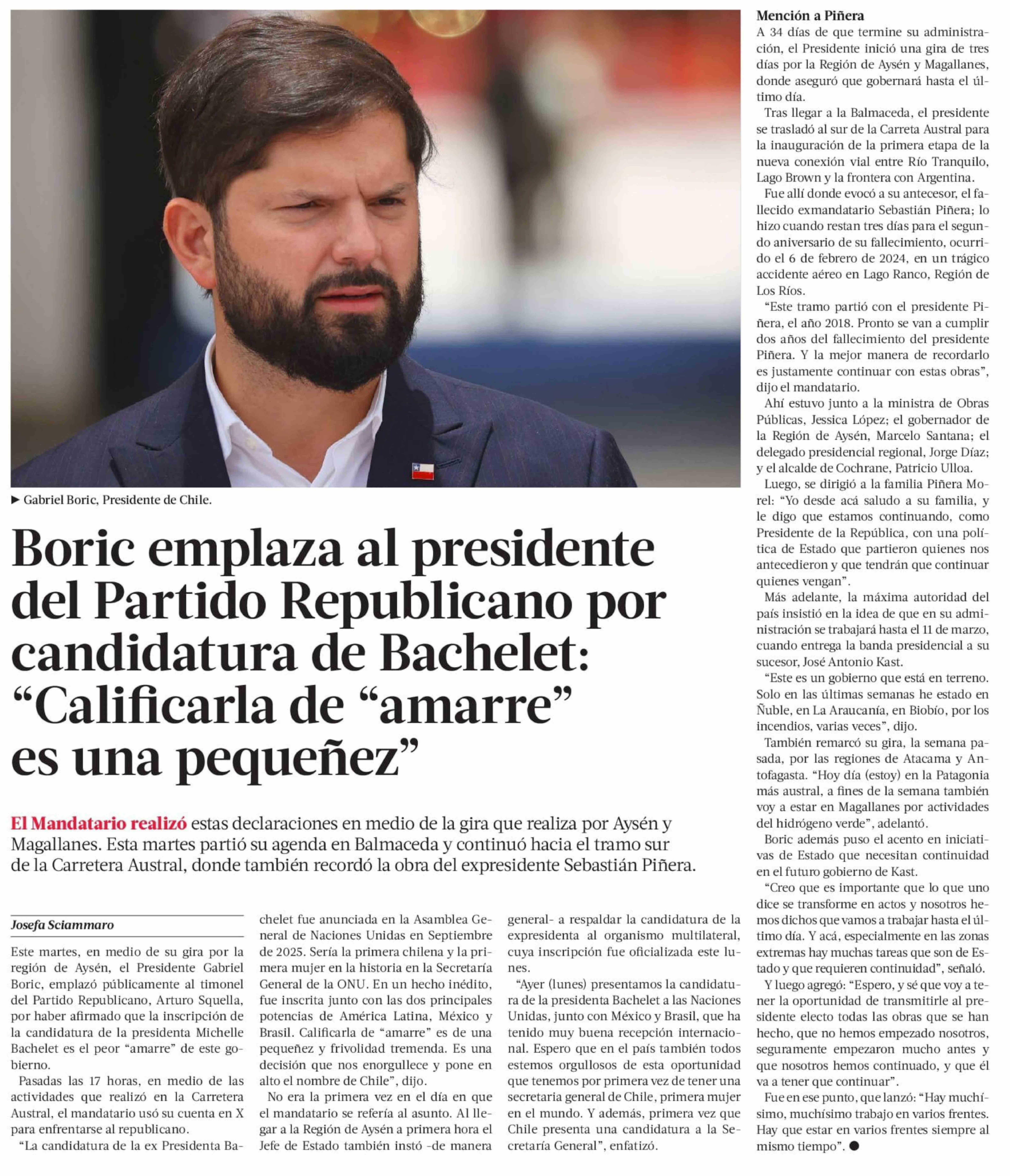 Título: Boric emplaza al presidente del Partido Republicano por candidatura de Bachelet: "Calificarla de "amarre" es una pequeñez"