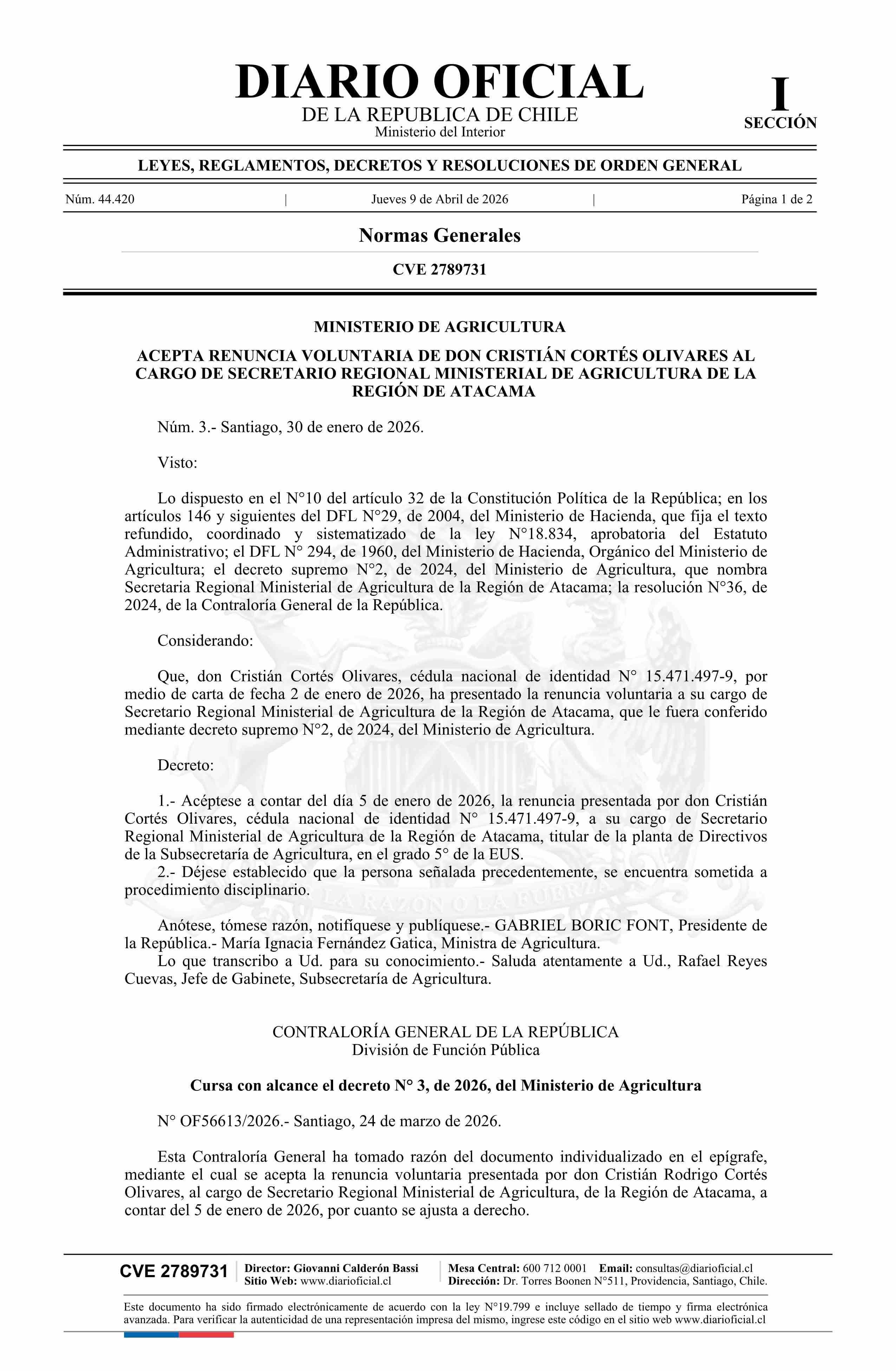 Decreto número 3, de 2026.- Acepta renuncia voluntaria de don Cristián Cortés Olivares al cargo de Secretario Regional Ministerial de Agricultura de la Región de Atacama 09-04-2026 Diario Oficial Edición Electrónica |