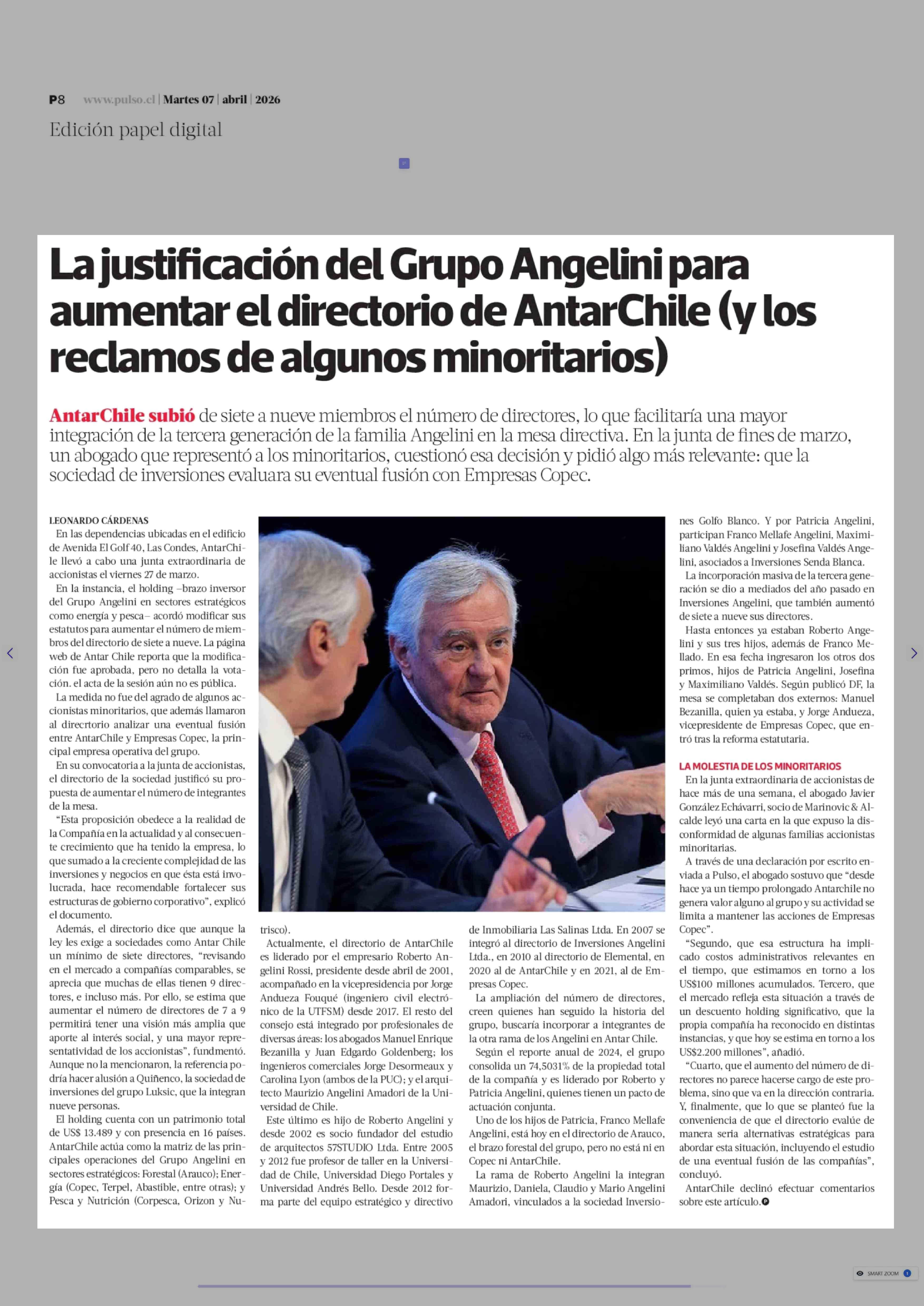 La justificación del Grupo Angelini para aumentar el directorio de AntarChile (y los reclamos de algunos minoritarios) 07-04-2026 La Tercera |