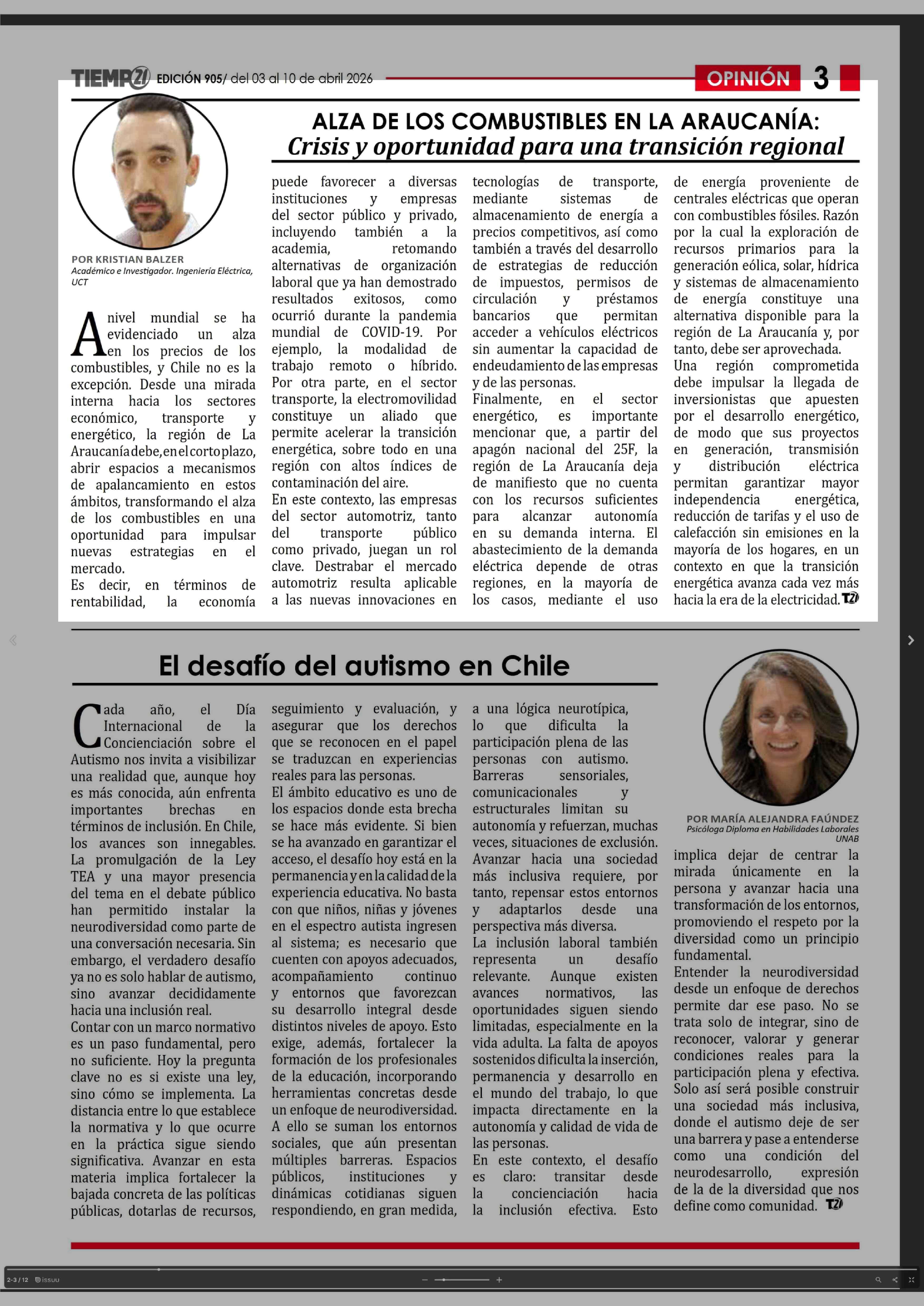 Columnas de Opinión: ALZA DE LOS COMBUSTIBLES EN LA ARAUCANÍA: Crisis y oportunidad para una transición regional 04-04-2026 Tiempo 21 |