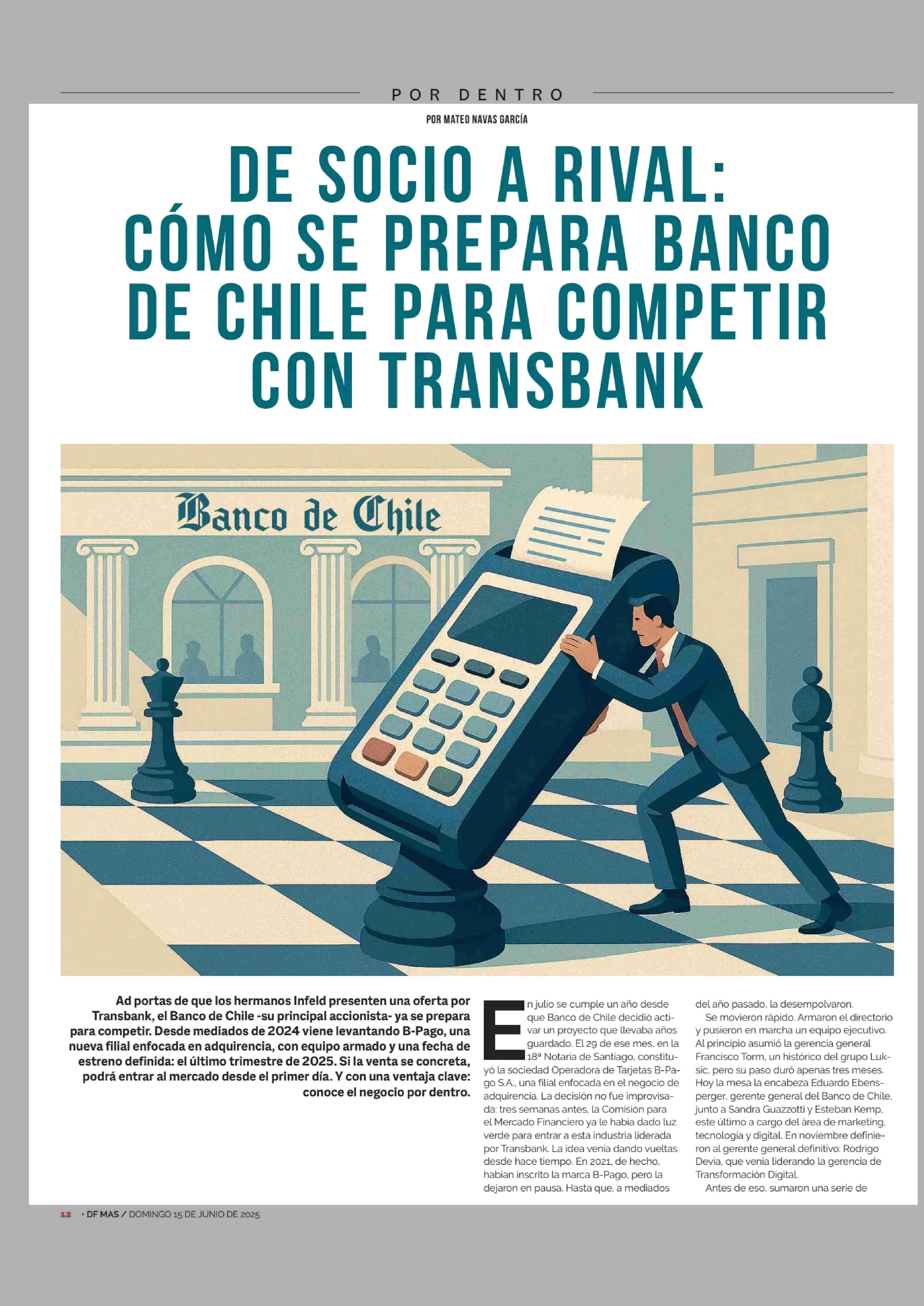 DE SOCIO A RIVAL: COMO SE PREPARA BANCO DE CHILE PARA COMPETIR CON TRANSBANK 15-06-2025 Diario Financiero |