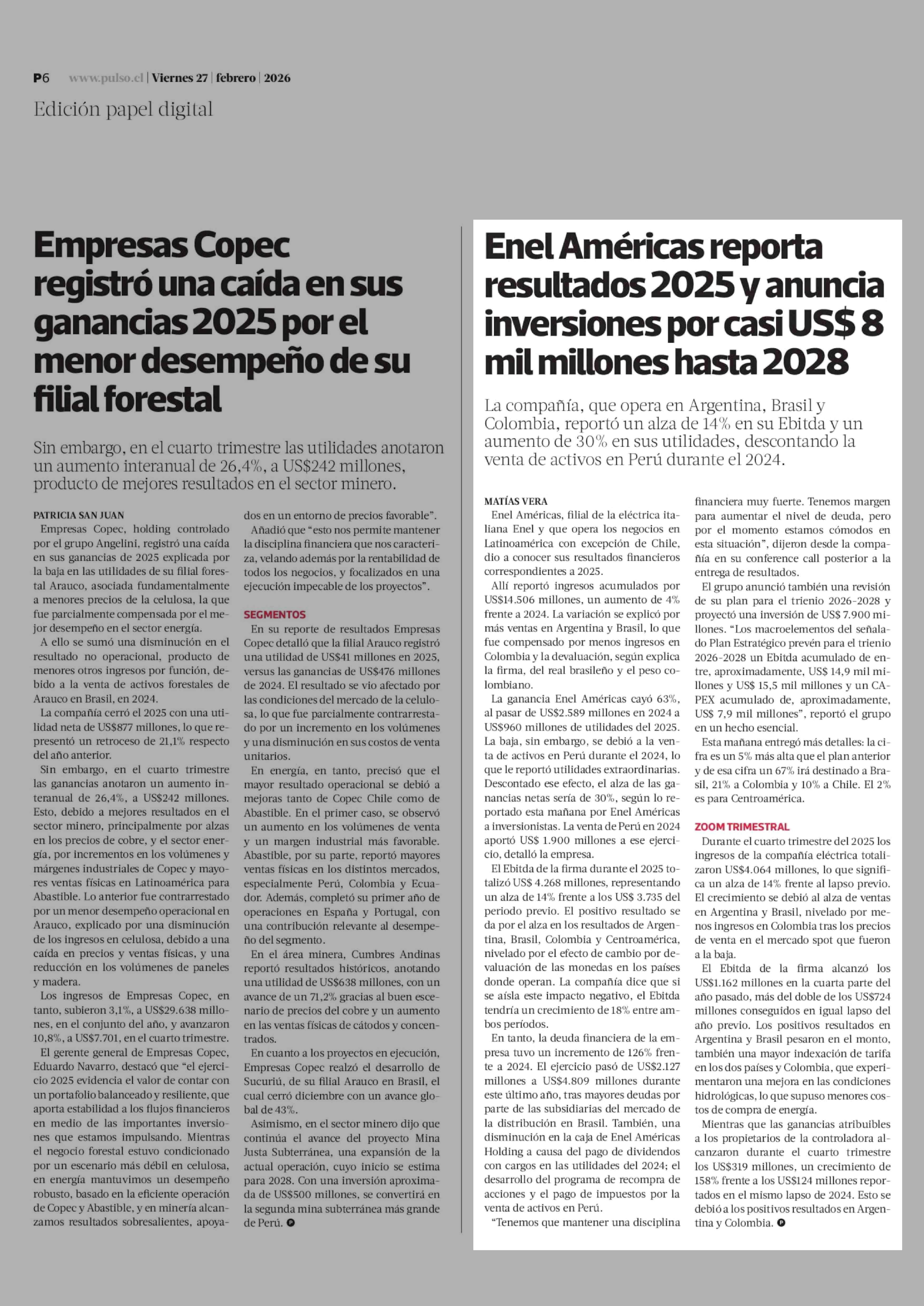 Enel Américas reporta resultados 2025 y anuncia inversiones por casi US$ 8 mil millones hasta 2028 27-02-2026 La Tercera |