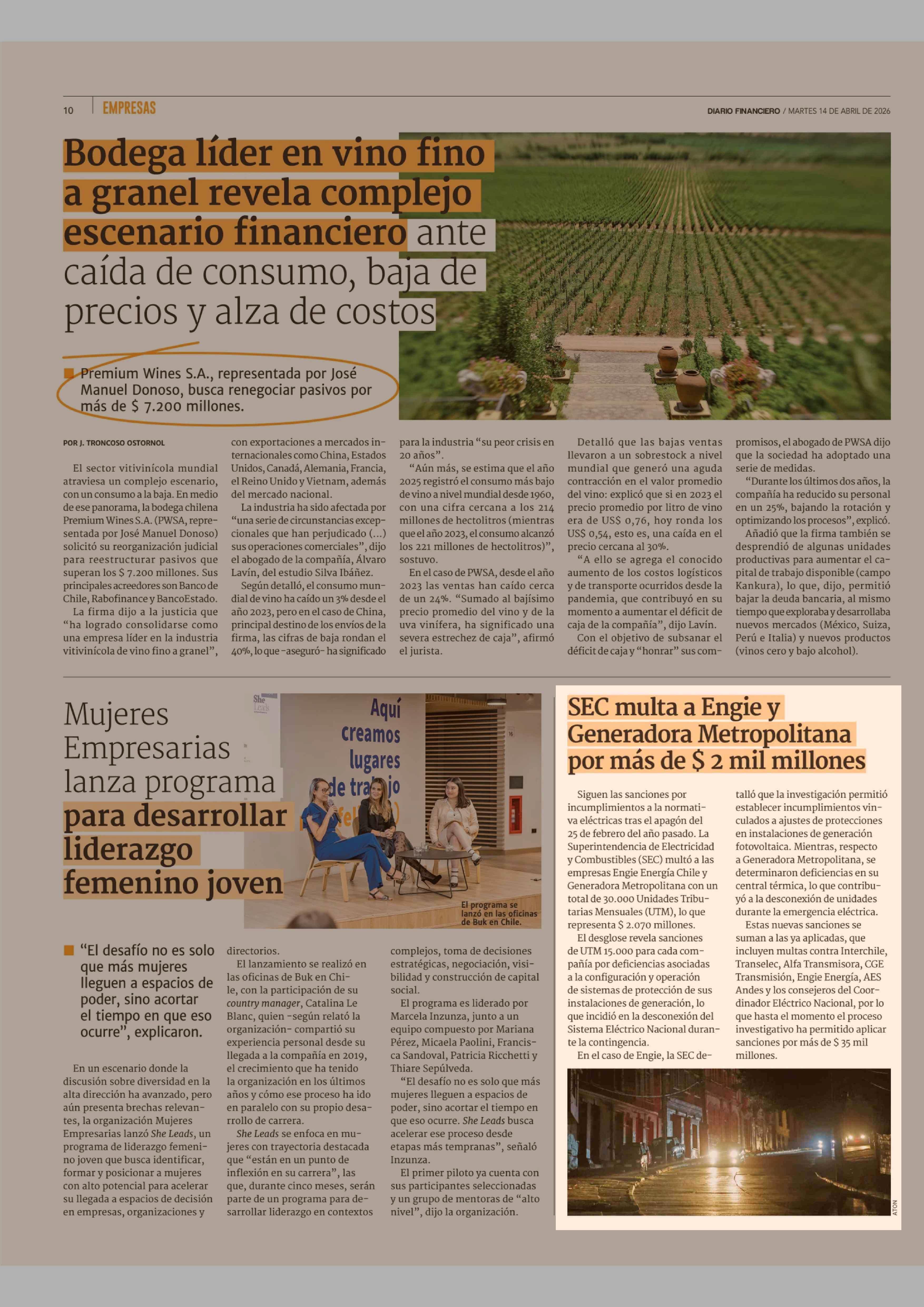 SEC multa a Engie y Generadora Metropolitana por más de $ 2 mil millones 14-04-2026 Diario Financiero |