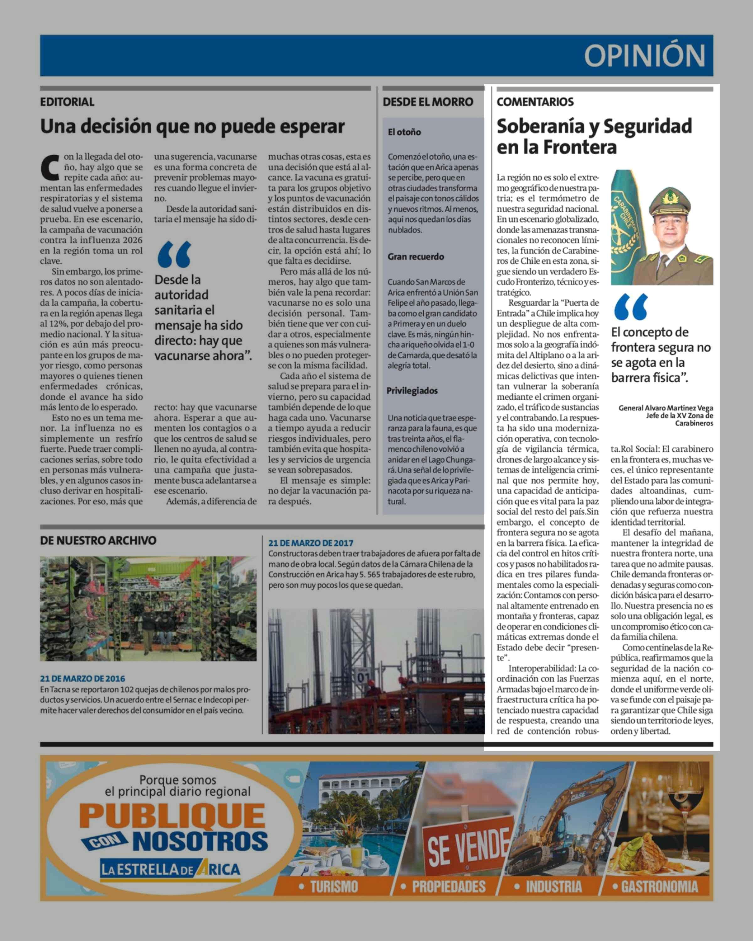 Columnas de Opinión: Soberanía y Seguridad en la Frontera 21-03-2026 La Estrella de Arica |