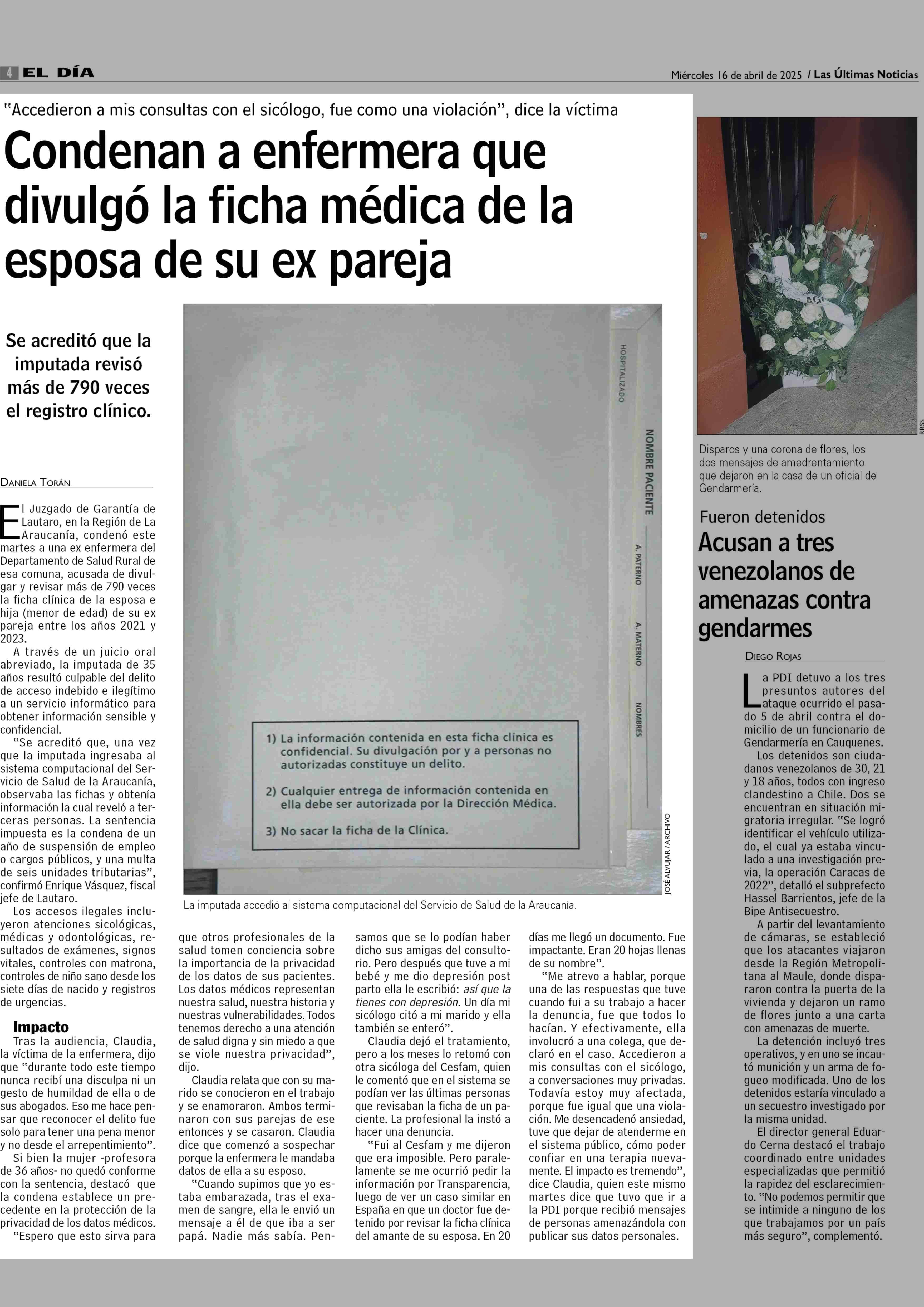 Condenan a enfermera que divulgó la ficha médica de la esposa de su ex pareja 16-04-2025 Las Últimas Noticias |