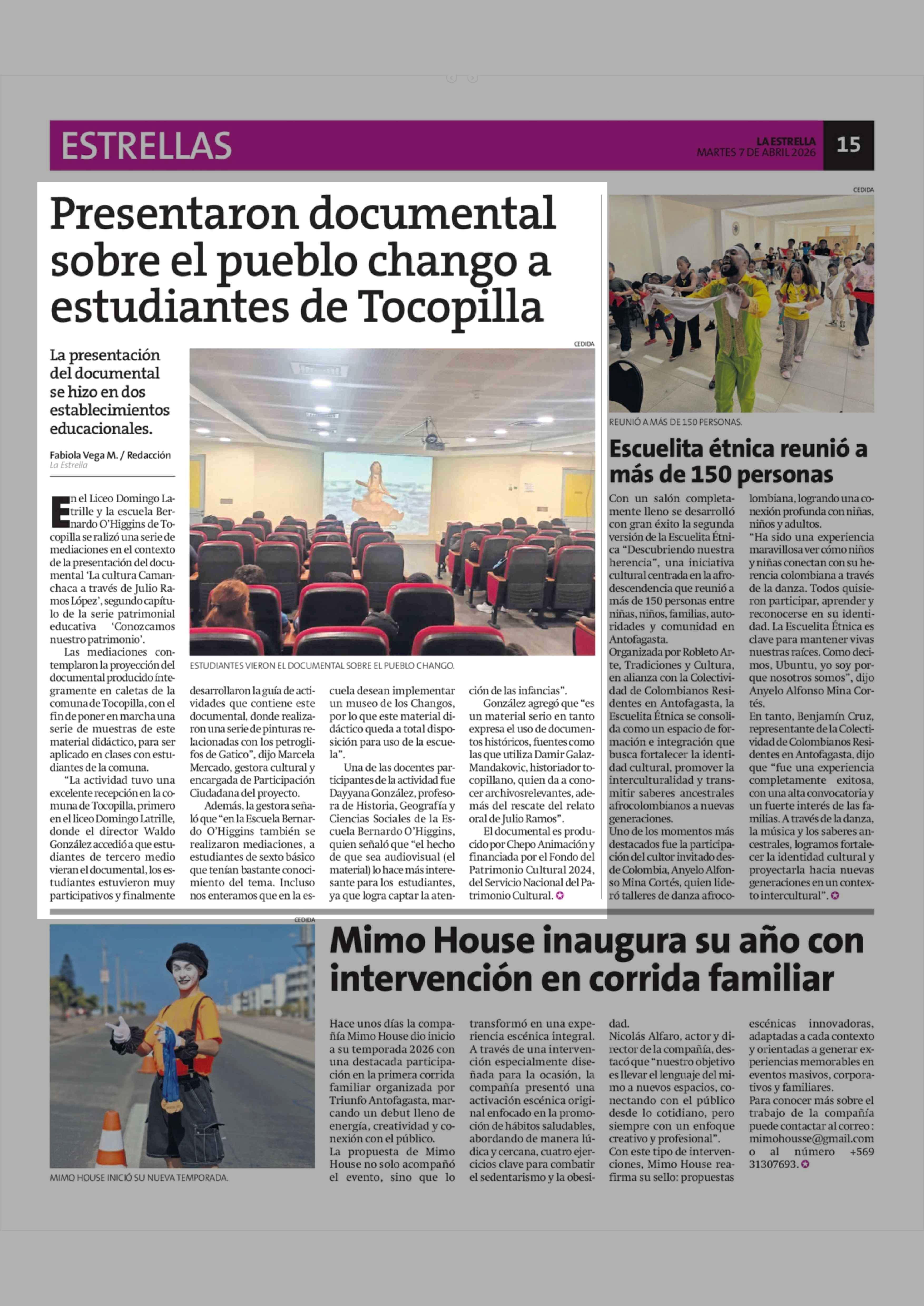 Presentaron documental sobre el pueblo chango a estudiantes de Tocopilla 07-04-2026 La Estrella de Antofagasta |