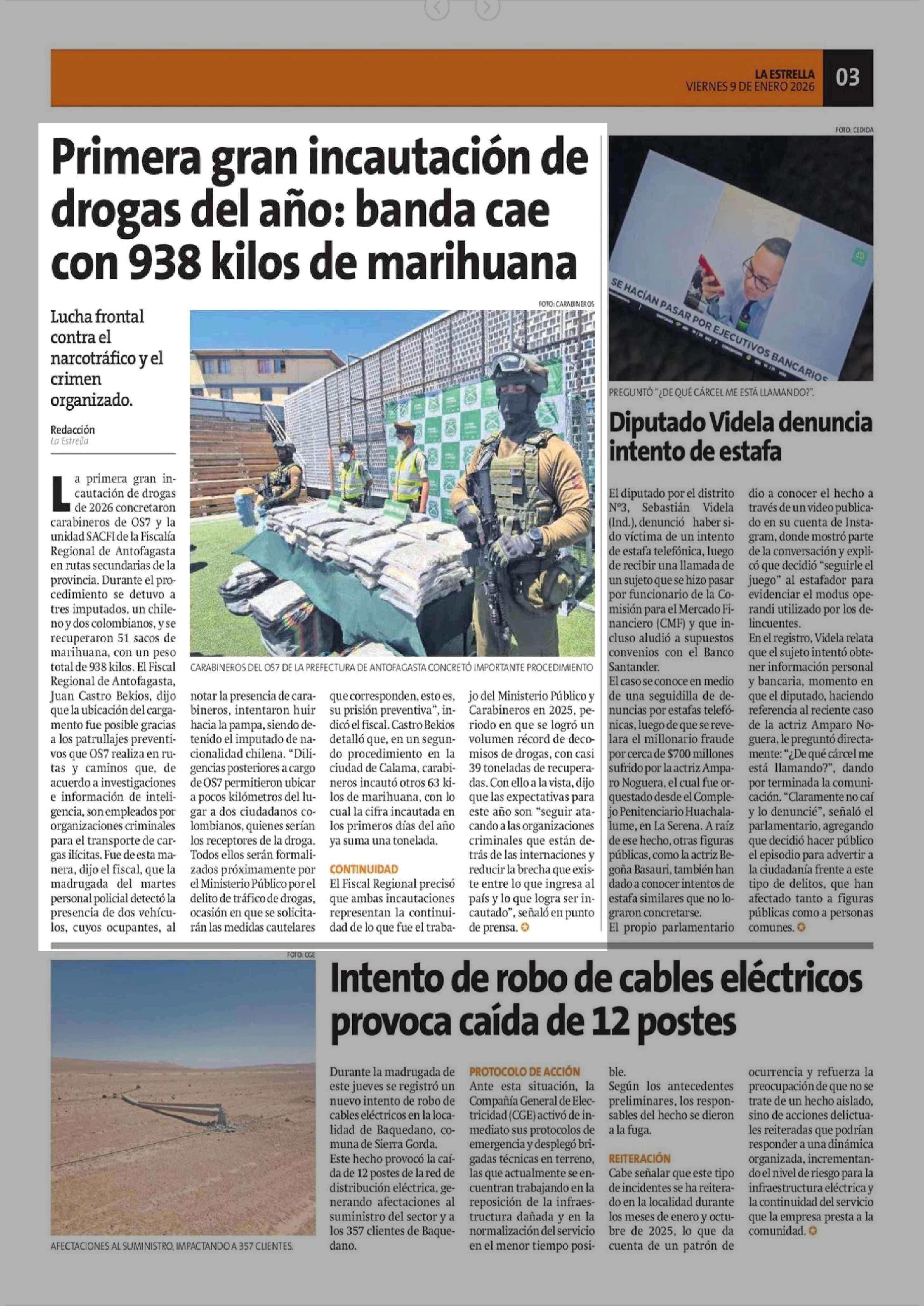 Primera gran incautación de drogas del año: banda cae con 938 kilos de marihuana 09-01-2026 La Estrella de Antofagasta |