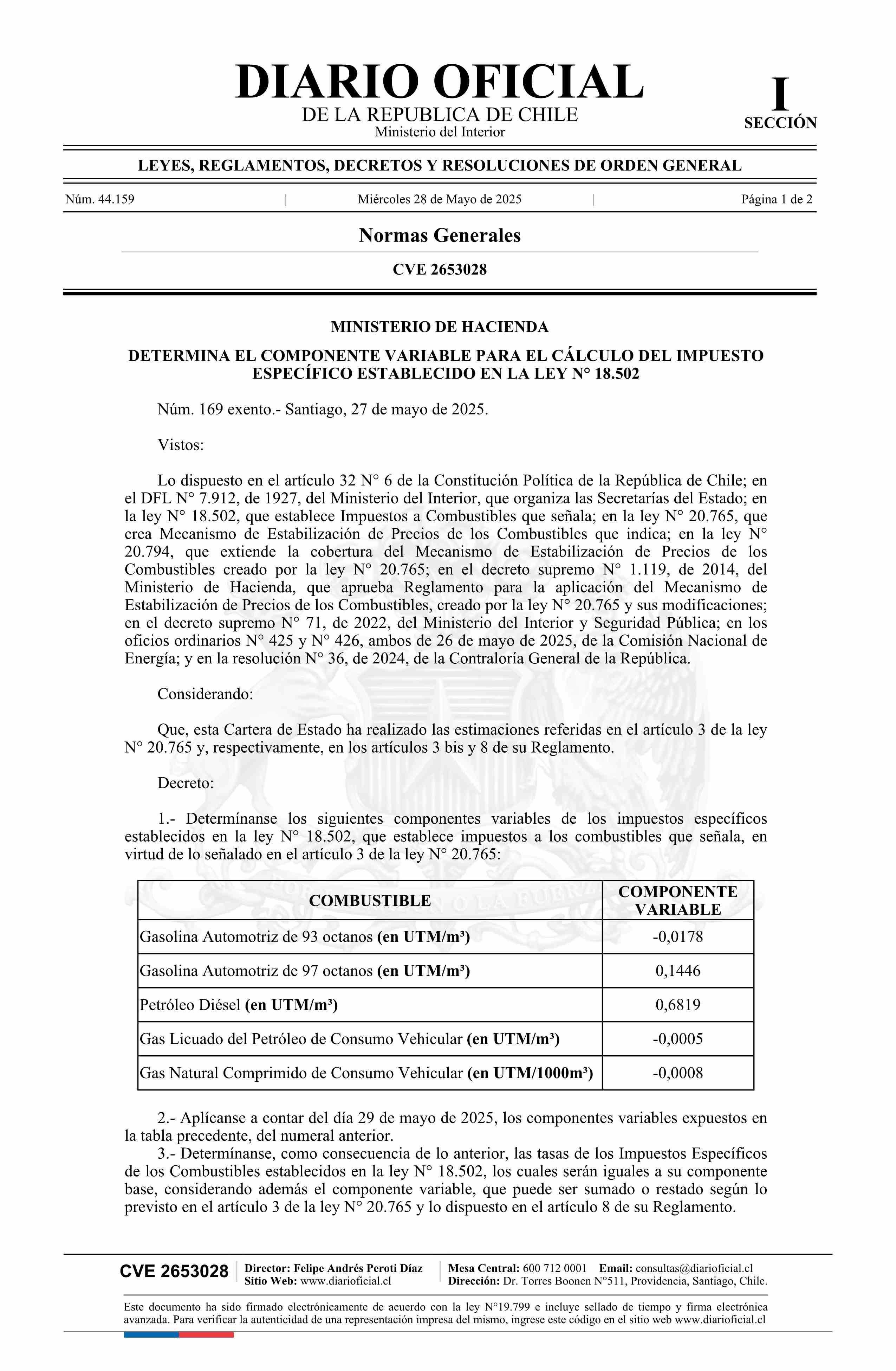 Decreto exento número 169, de 2025.- Determina el componente variable para el cálculo del impuesto específico establecido en la ley N° 18.502 28-05-2025 DIARIO OFICIAL CHILE - BOLETÍN OFICIAL DE MINERÍA |