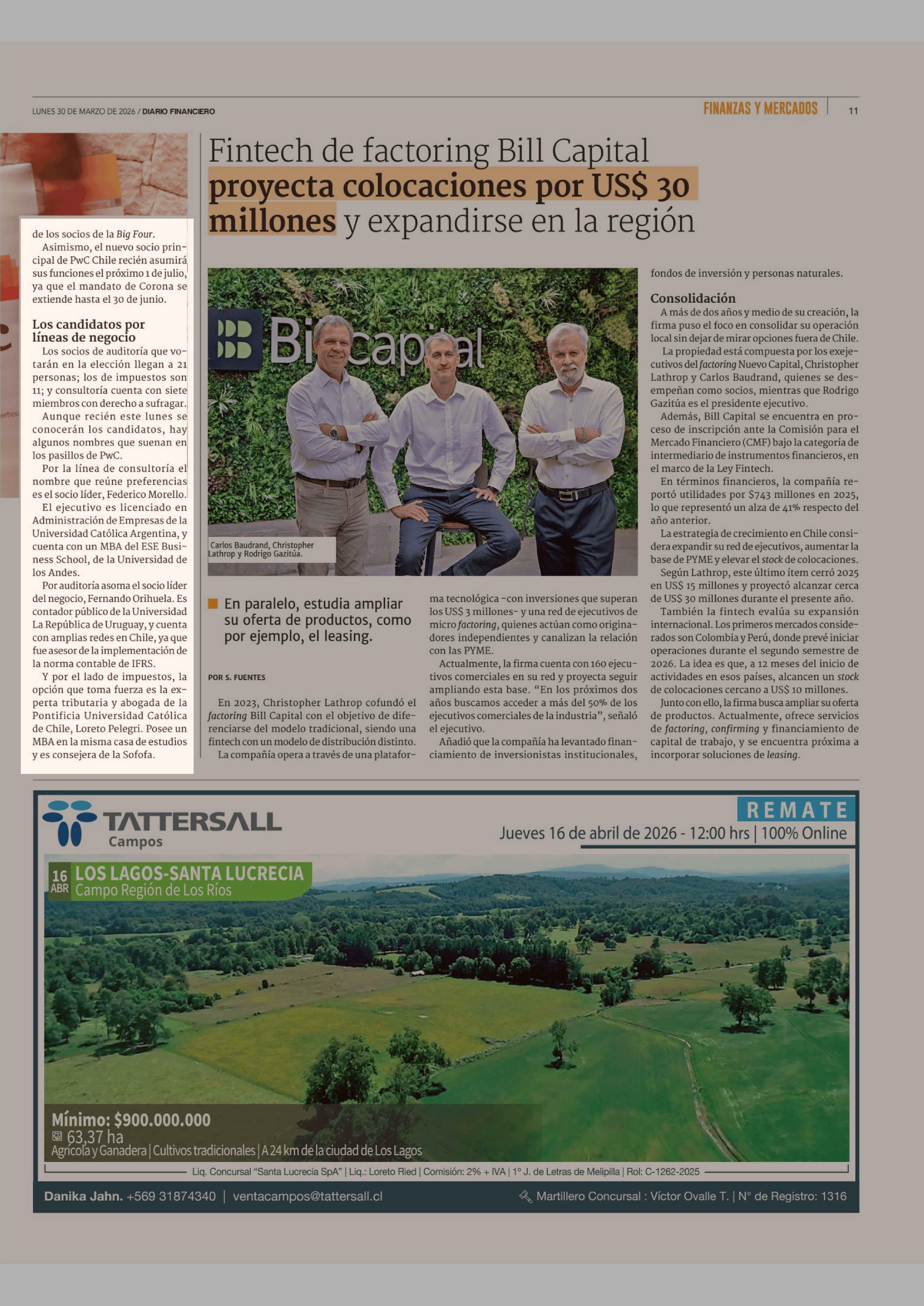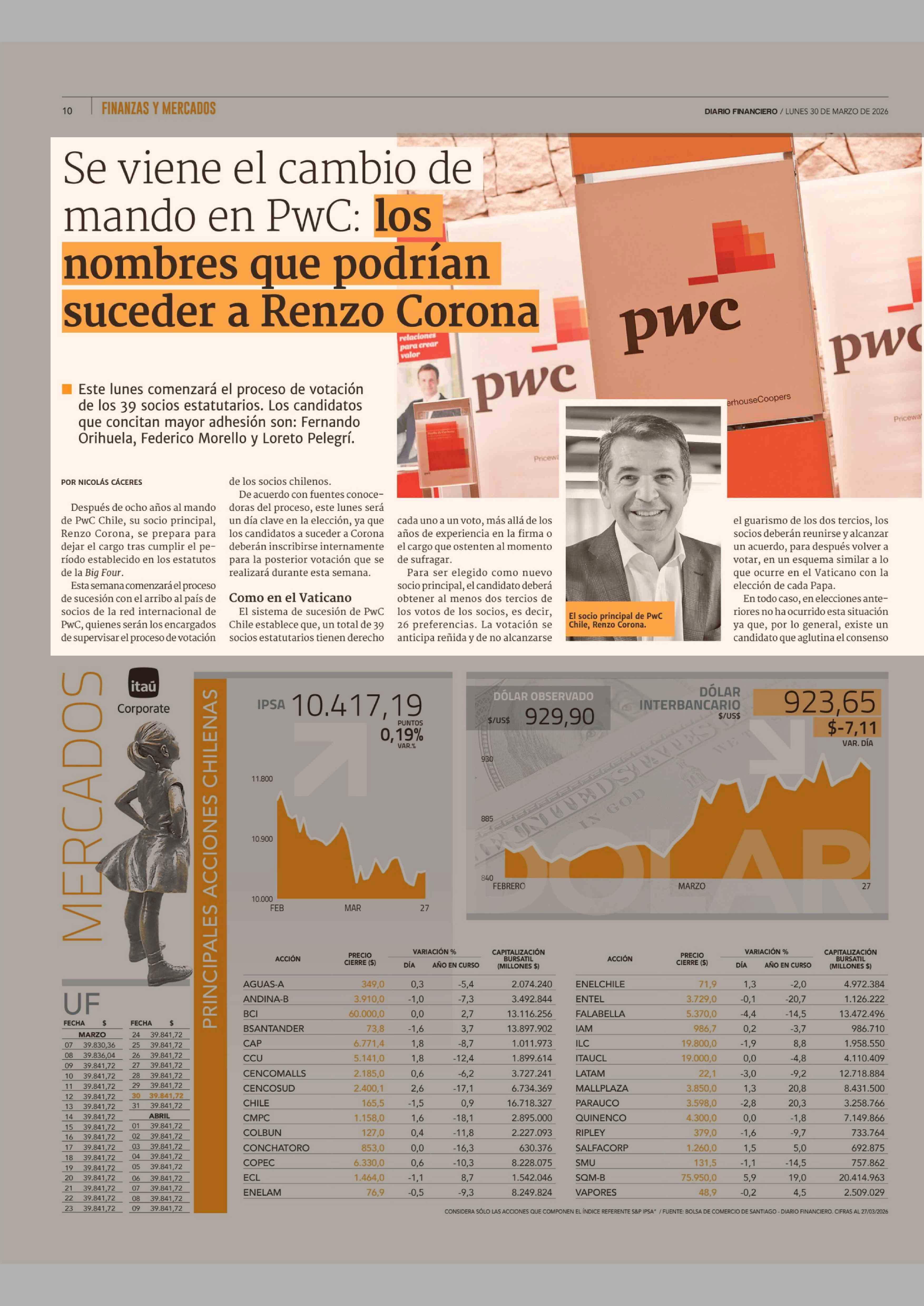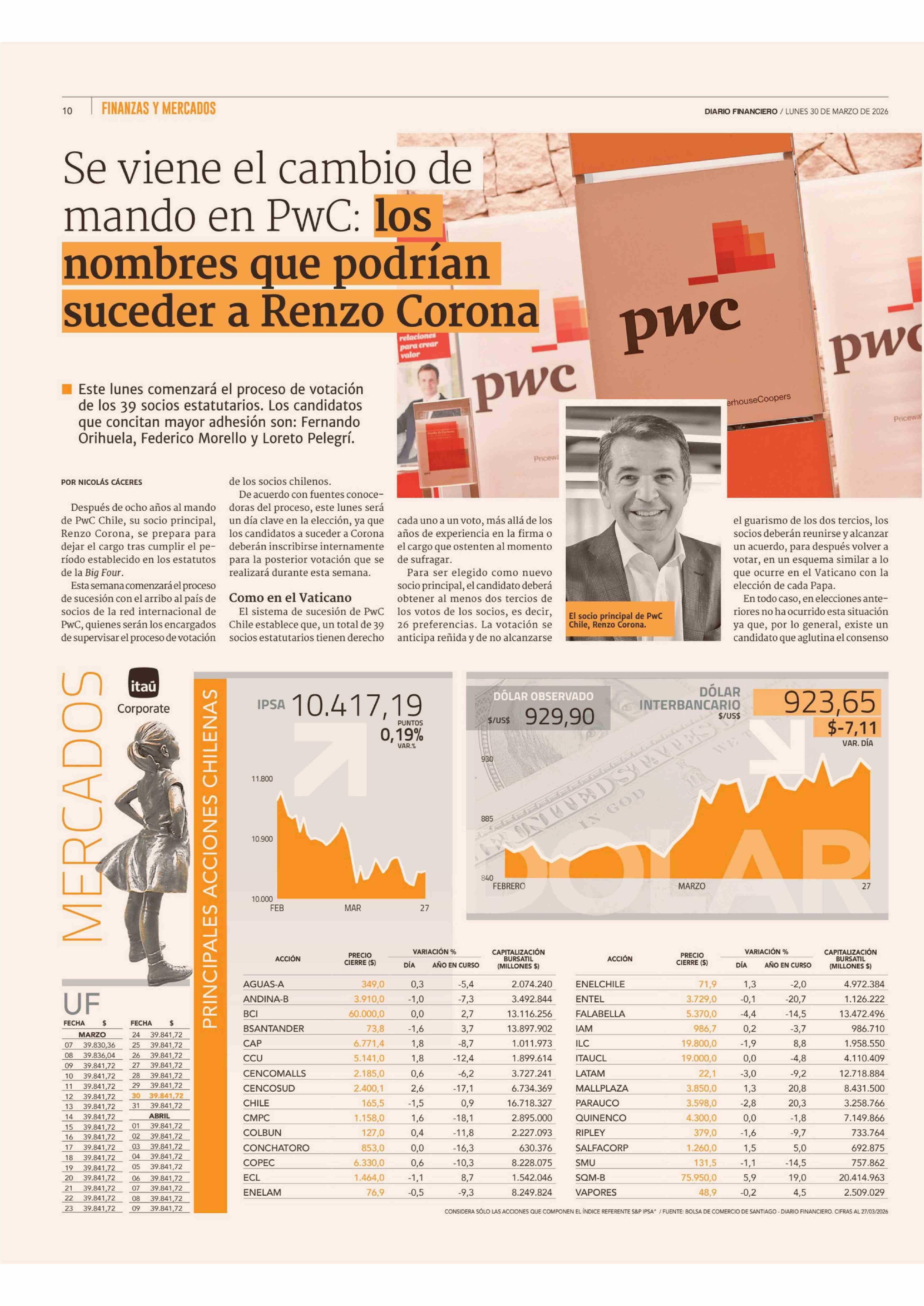 Se viene el cambio de mando en PwC: los nombres que podrían suceder a Renzo Corona 30-03-2026 Diario Financiero |