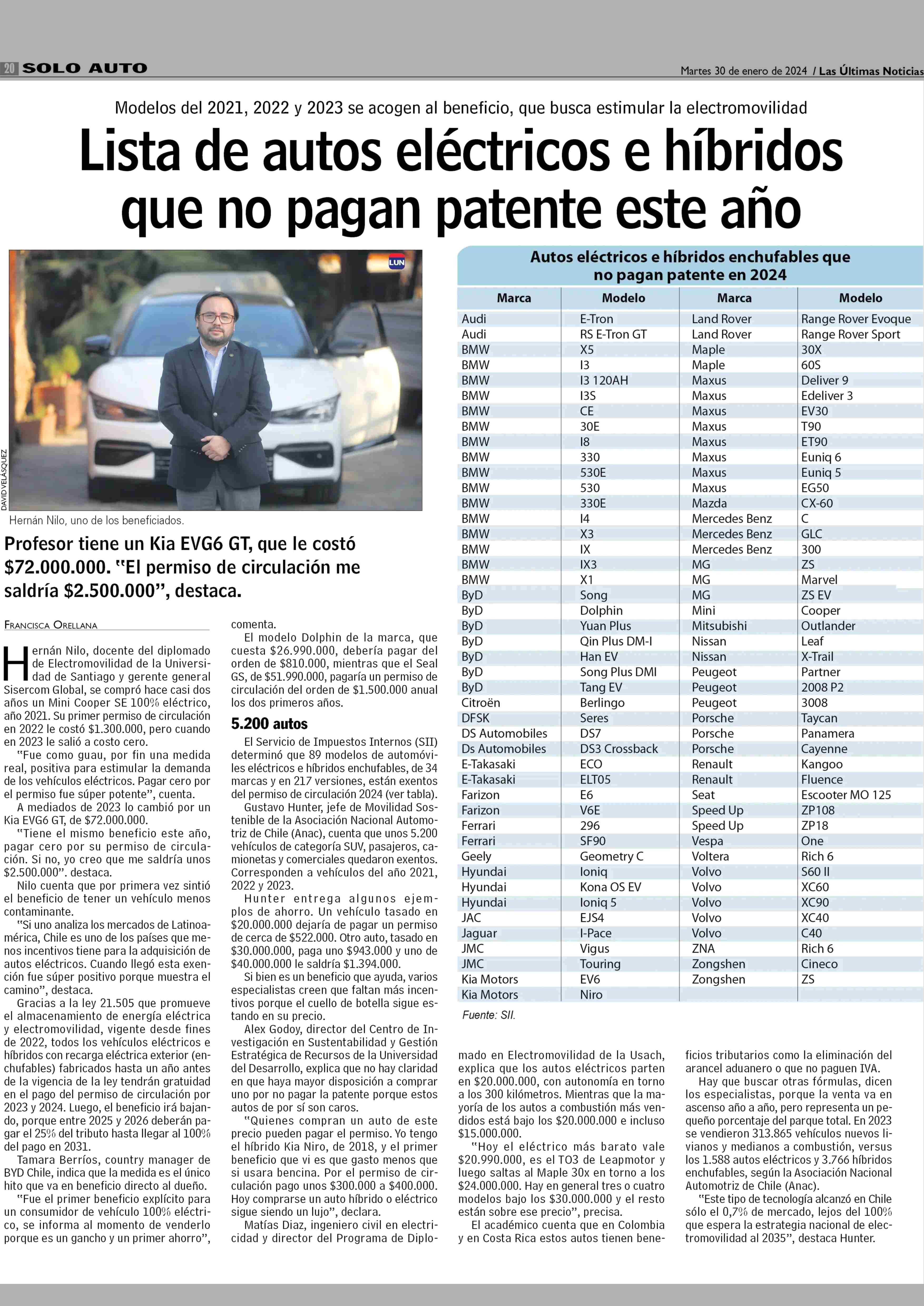 Lista de autos eléctricos e hibridos que no pagan patente este año 30-01-2024 Las Últimas Noticias |