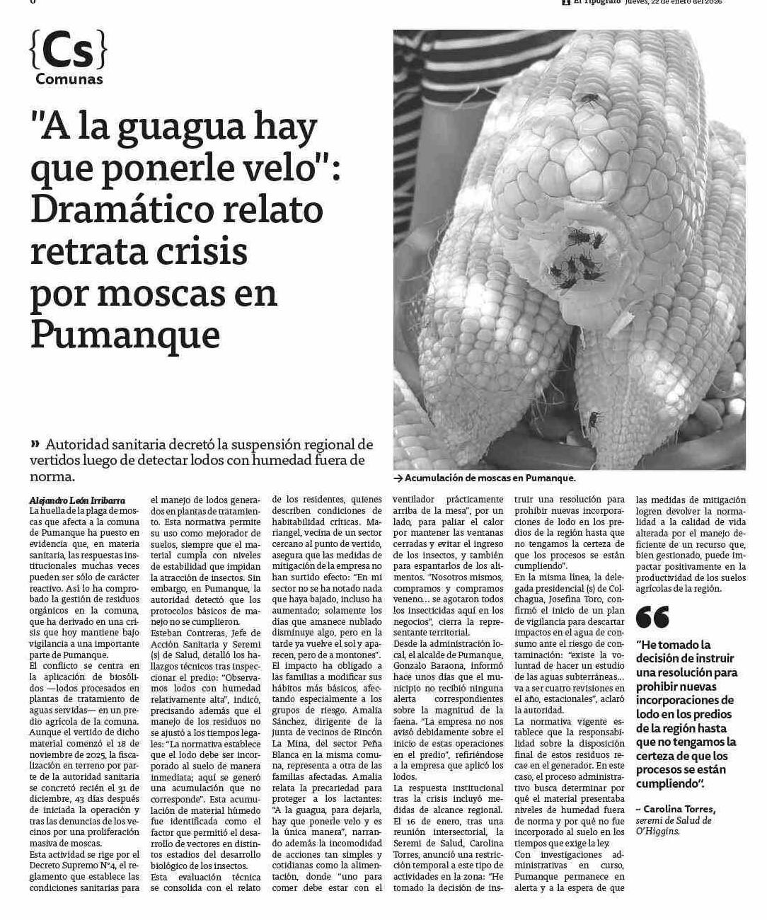 "A la guagua hay que ponerle velo": Dramático relato retrata crisis por moscas en Pumanque 22-01-2026 El Tipógrafo |