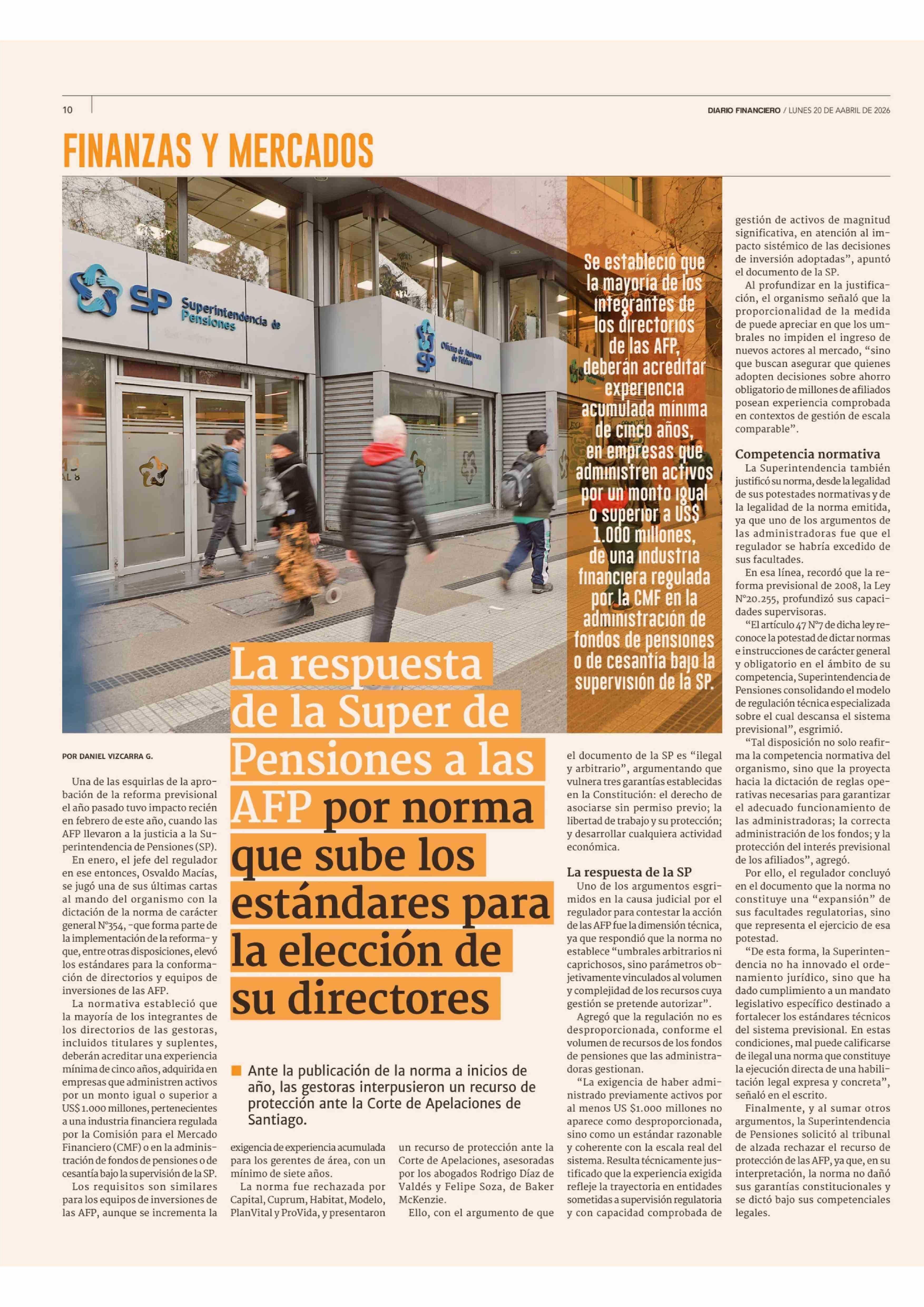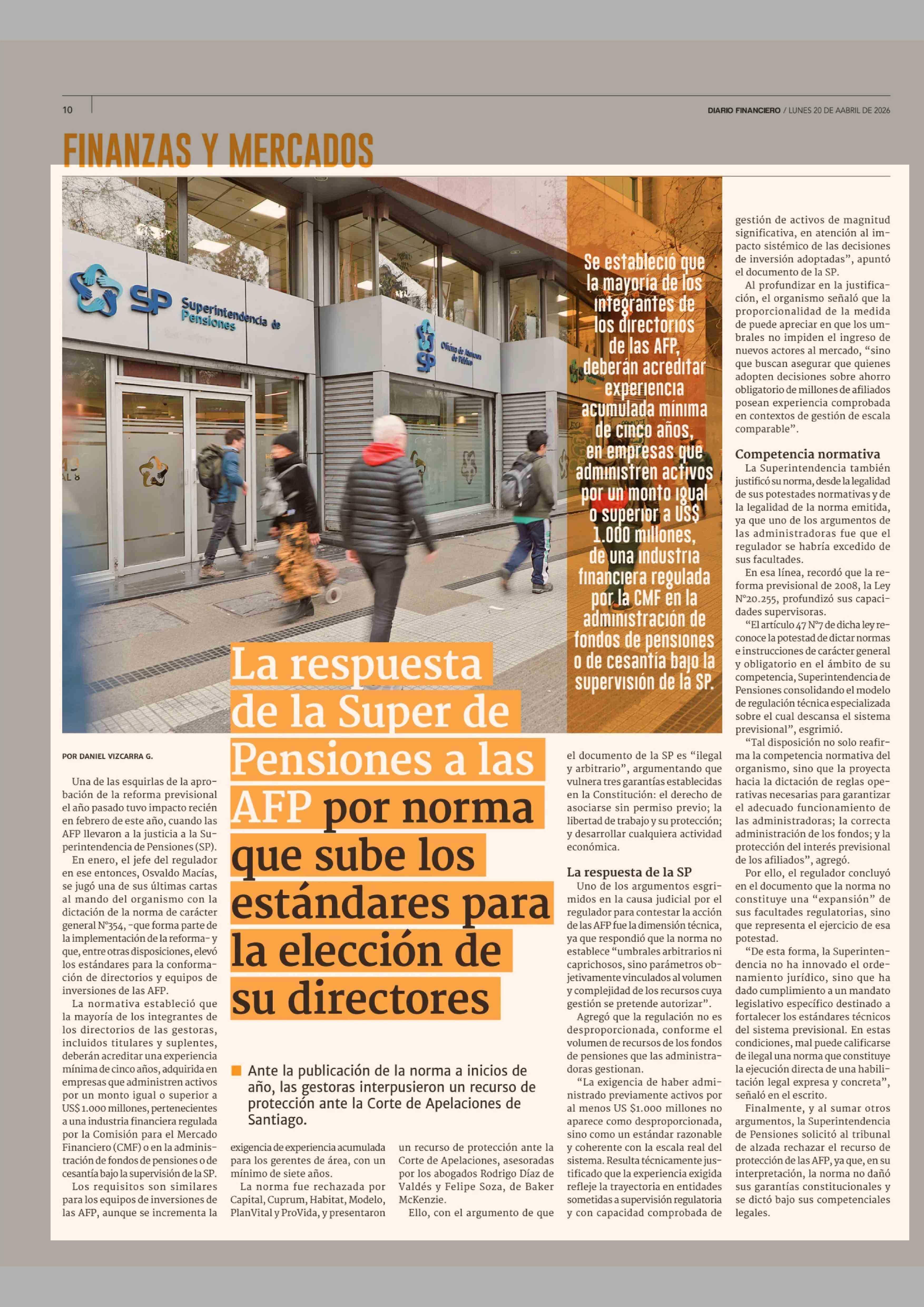 La respuesta de la Super de Pensiones a las AFP por norma que sube los estándares para la elección de su directores 20-04-2026 Diario Financiero |