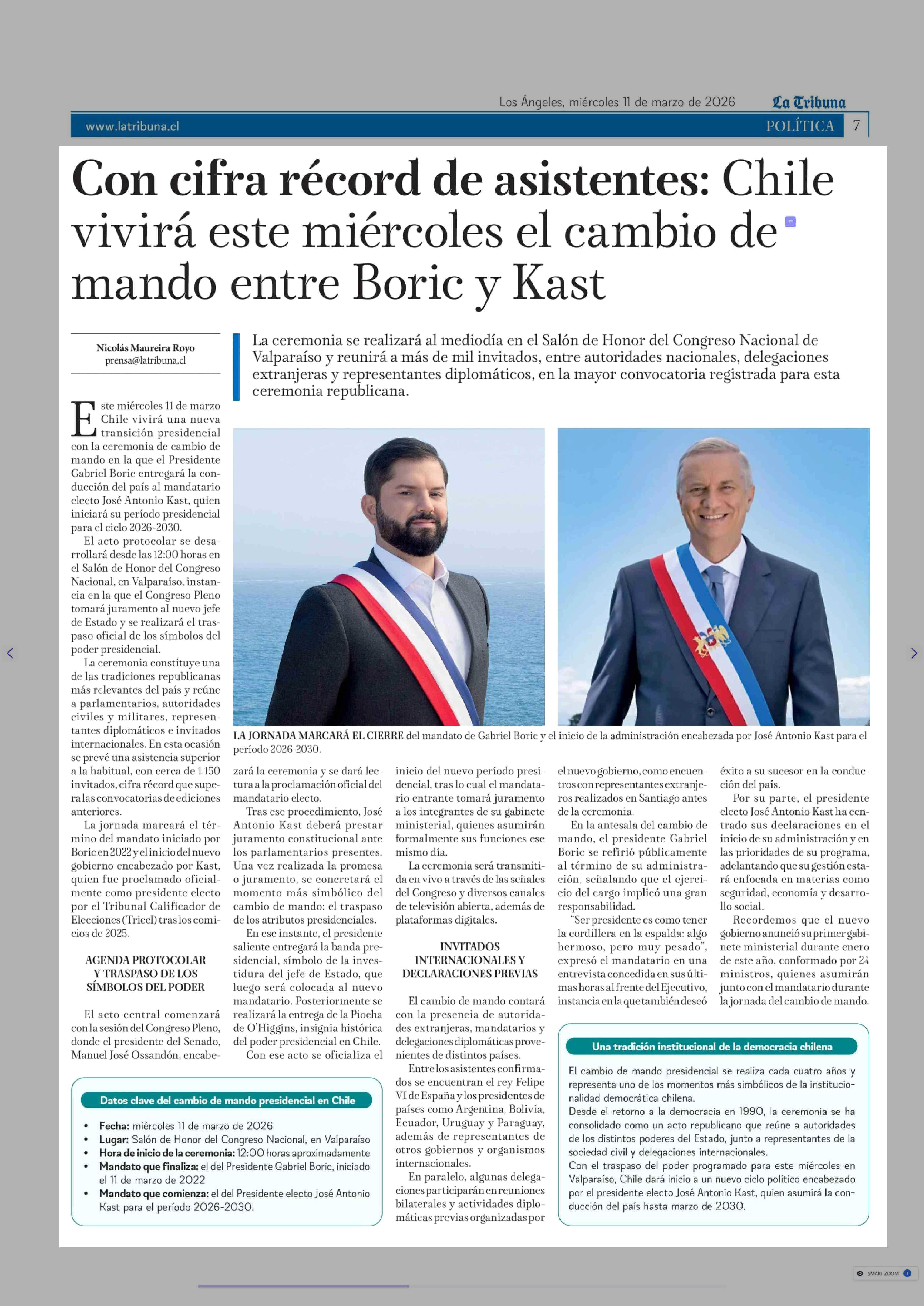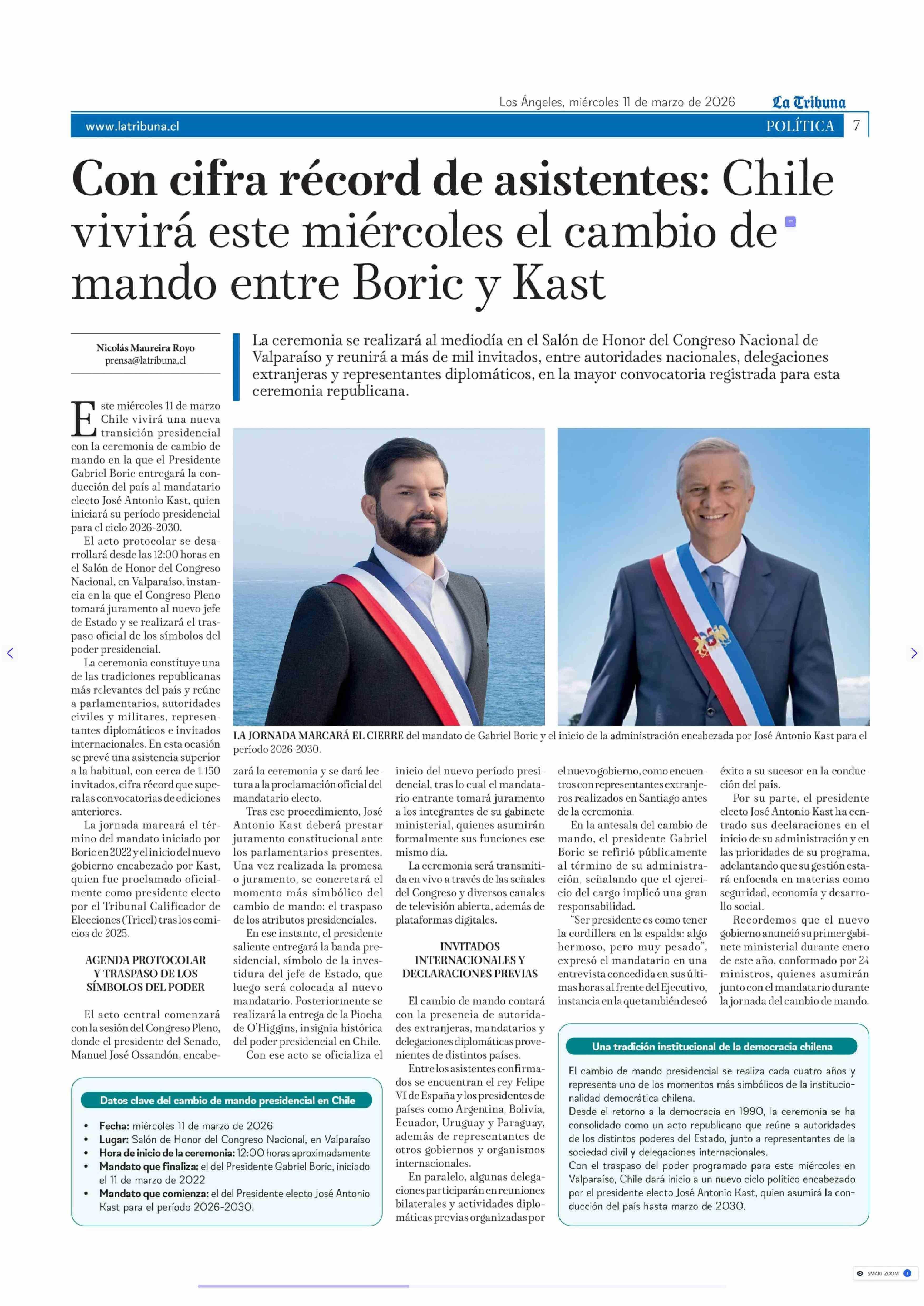 Con cifra récord de asistentes: Chile vivirá este miércoles el cambio de mando entre Boric y Kast 11-03-2026 La Tribuna |