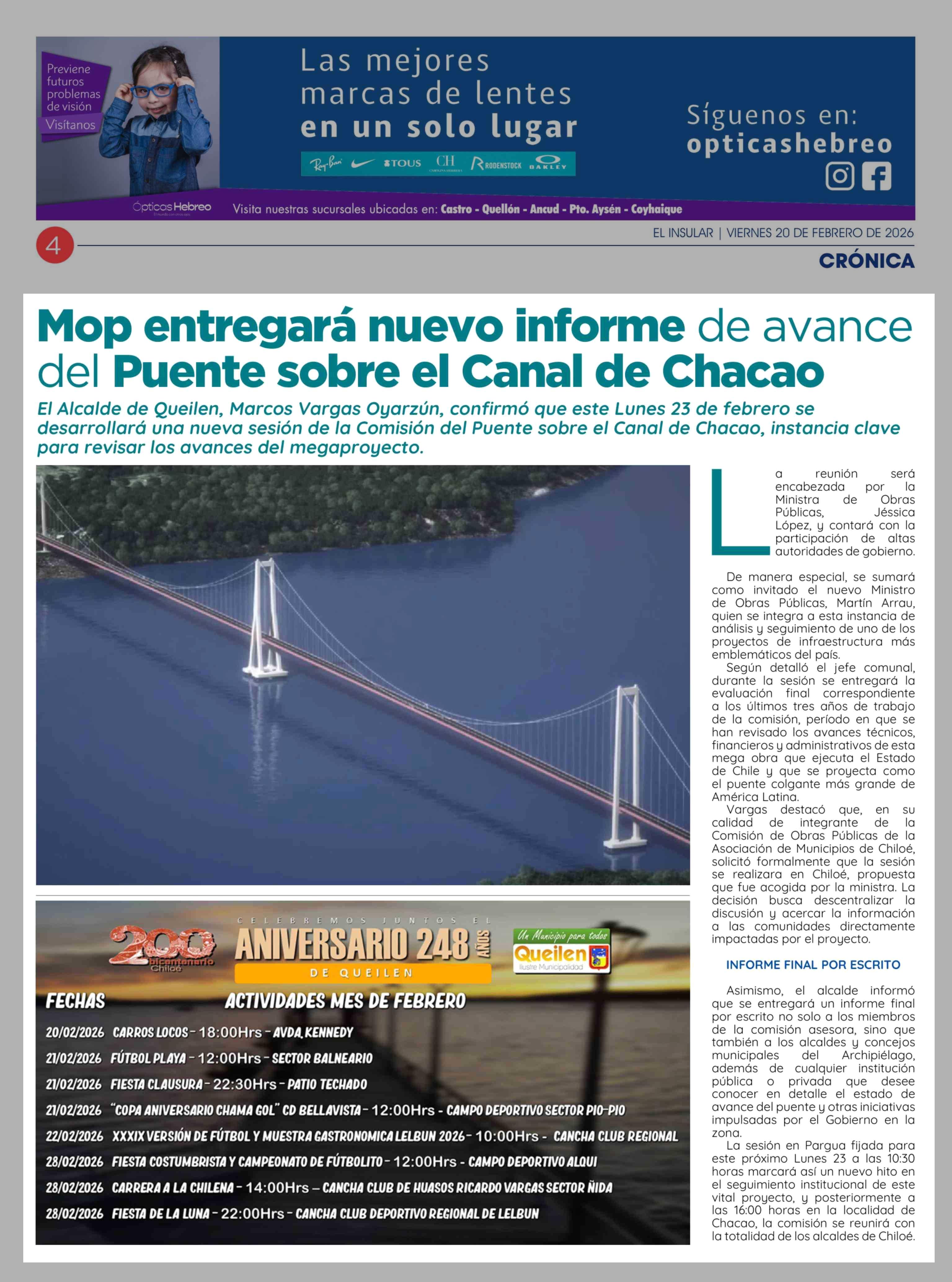 Mop entregará nuevo informe de avance del Puente sobre el Canal de Chacao 20-02-2026 El Insular |