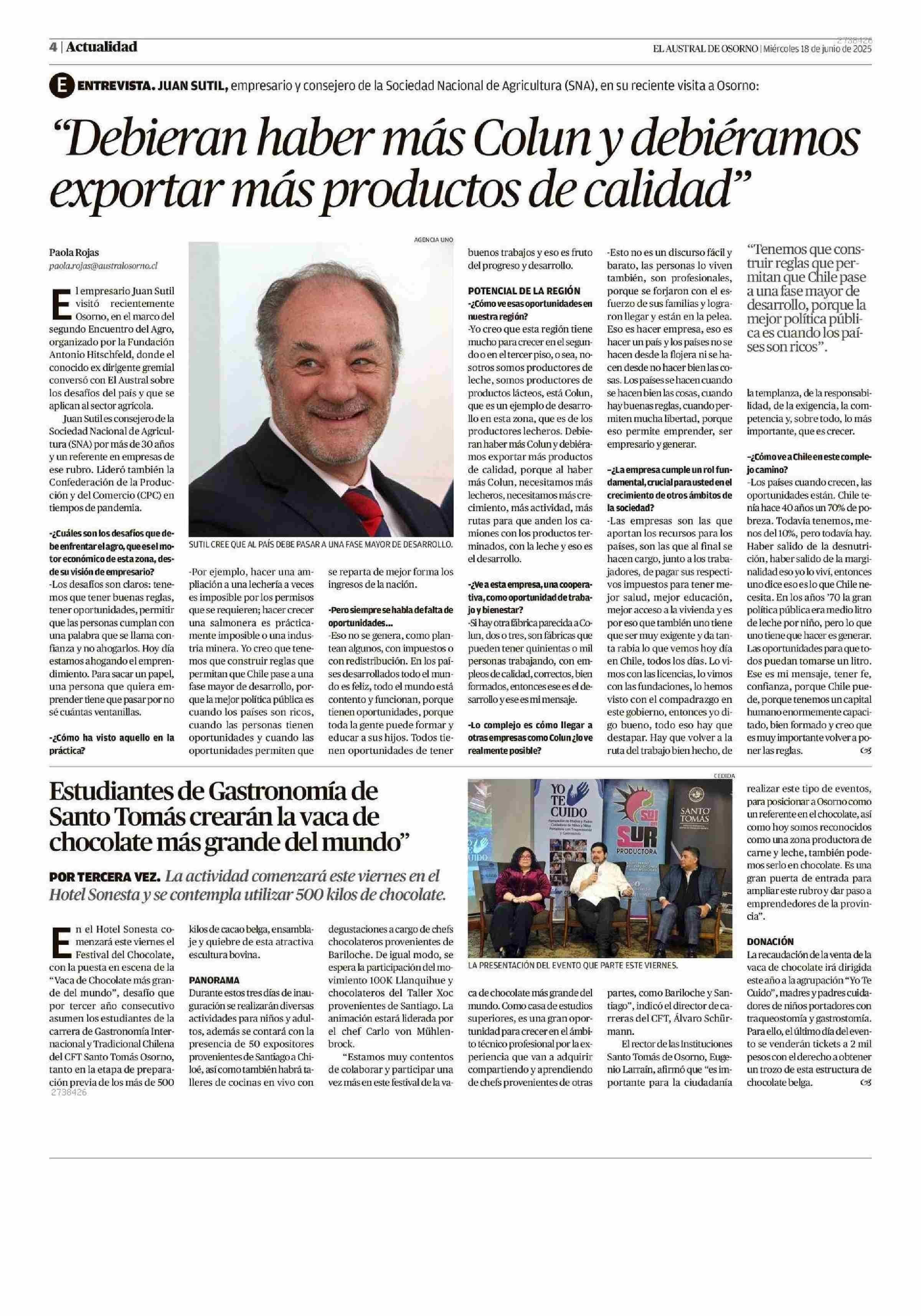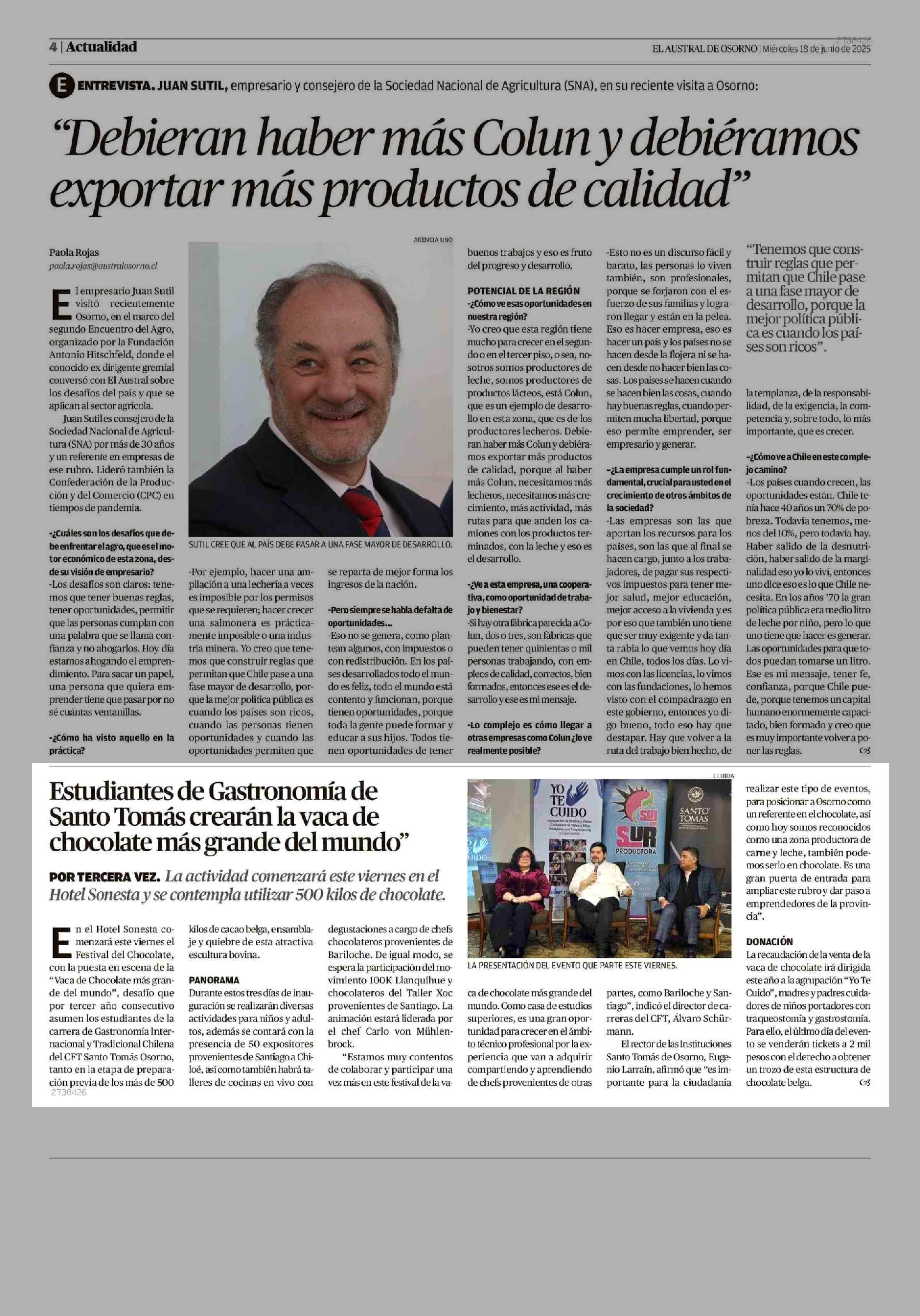 Estudiantes de Gastronomía de Santo Tomás crearán la vaca de chocolate más grande del mundo" 18-06-2025 El Austral de Osorno |