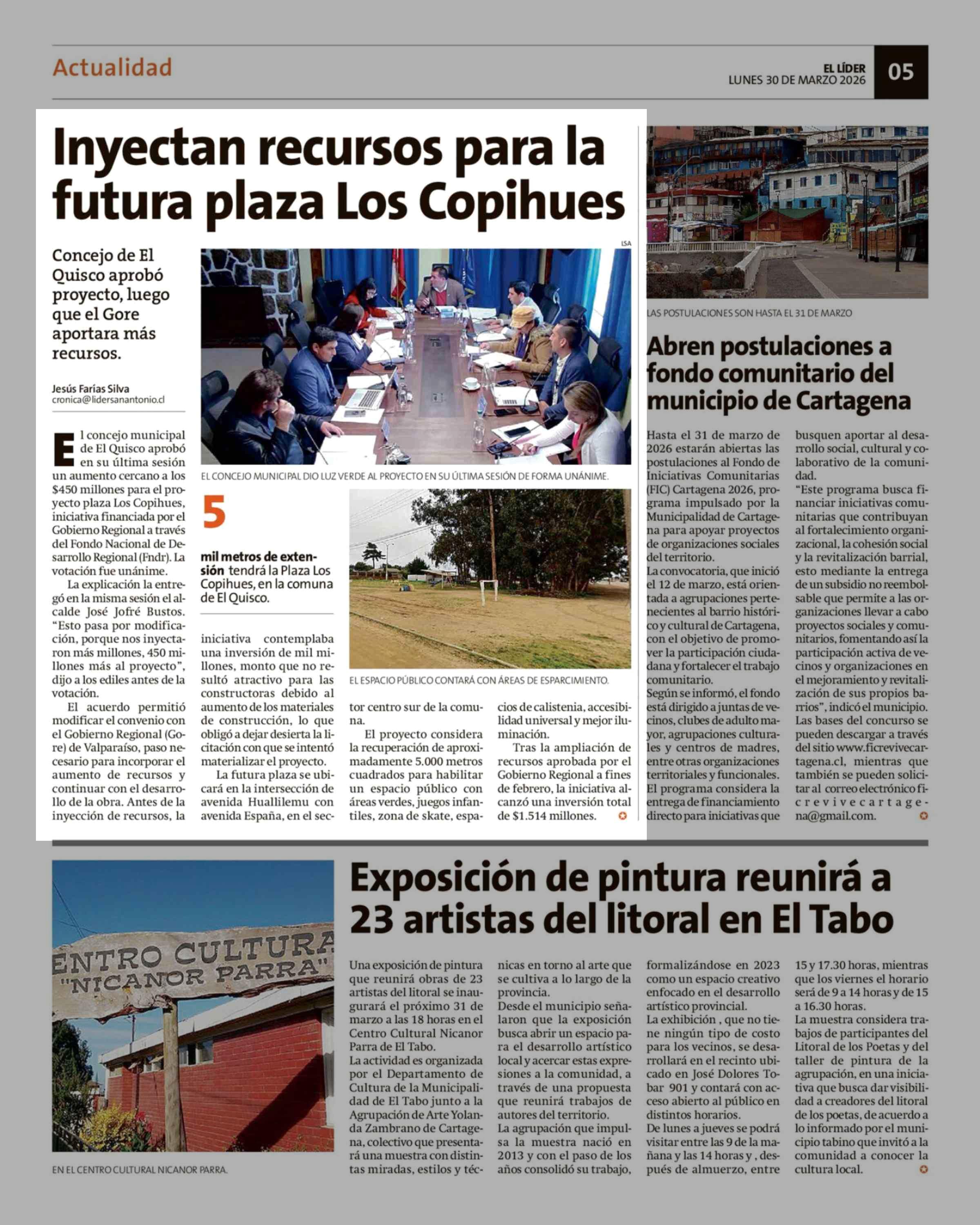 Inyectan recursos para la futura plaza Los Copihues 30-03-2026 El Líder |
