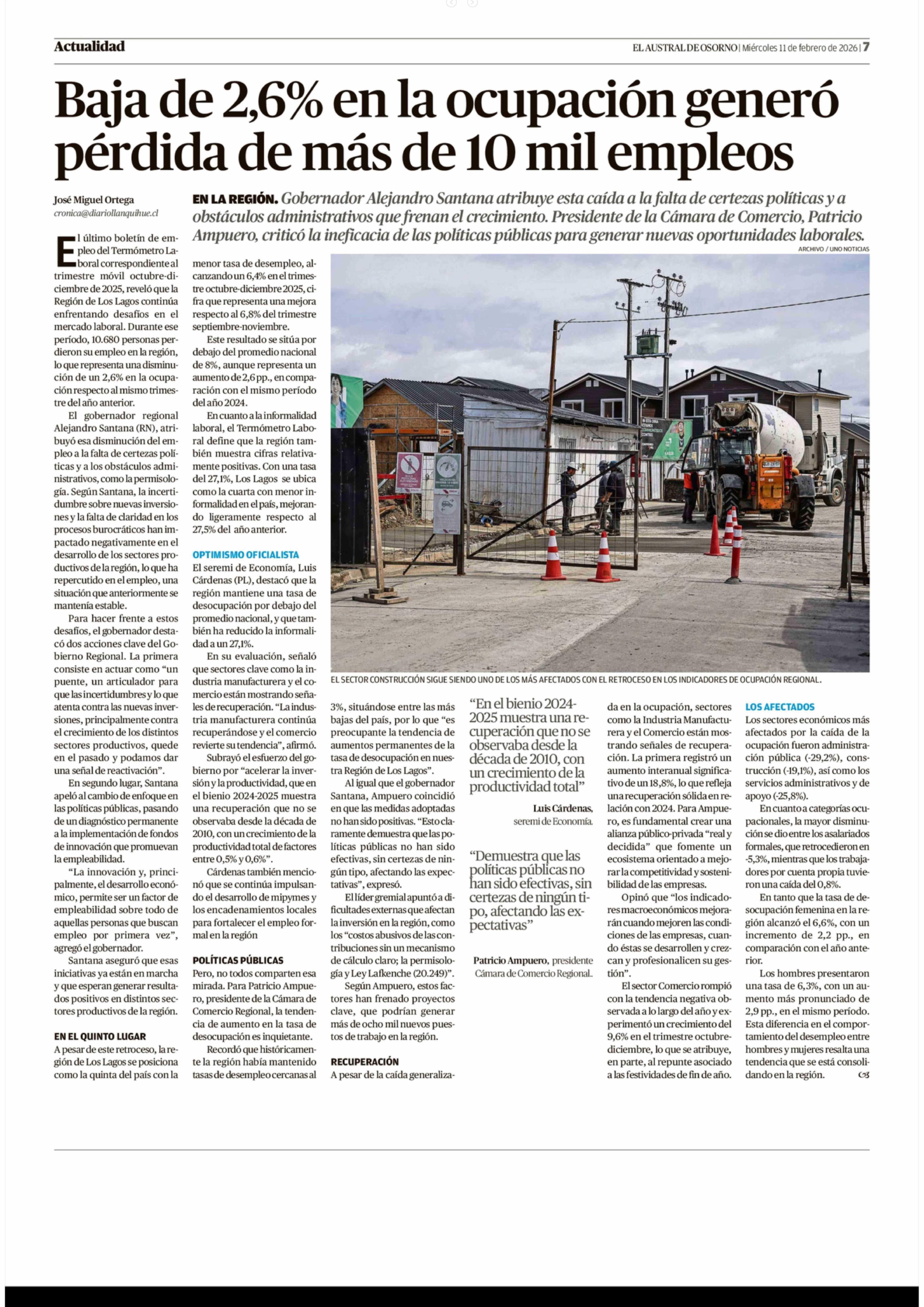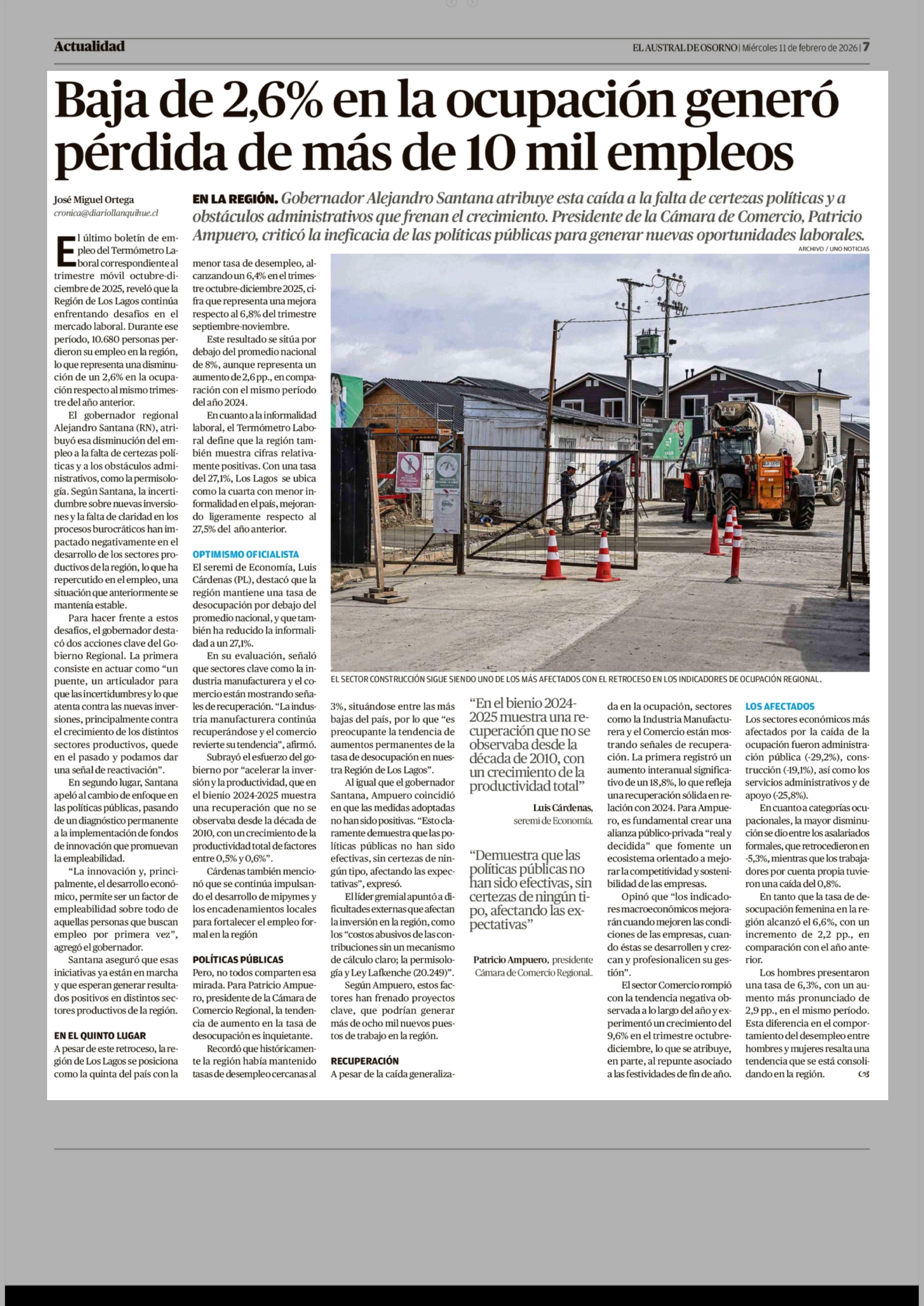 Baja de 2,6% en la ocupación generó pérdida de más de 10 mil empleos 11-02-2026 El Austral de Osorno |