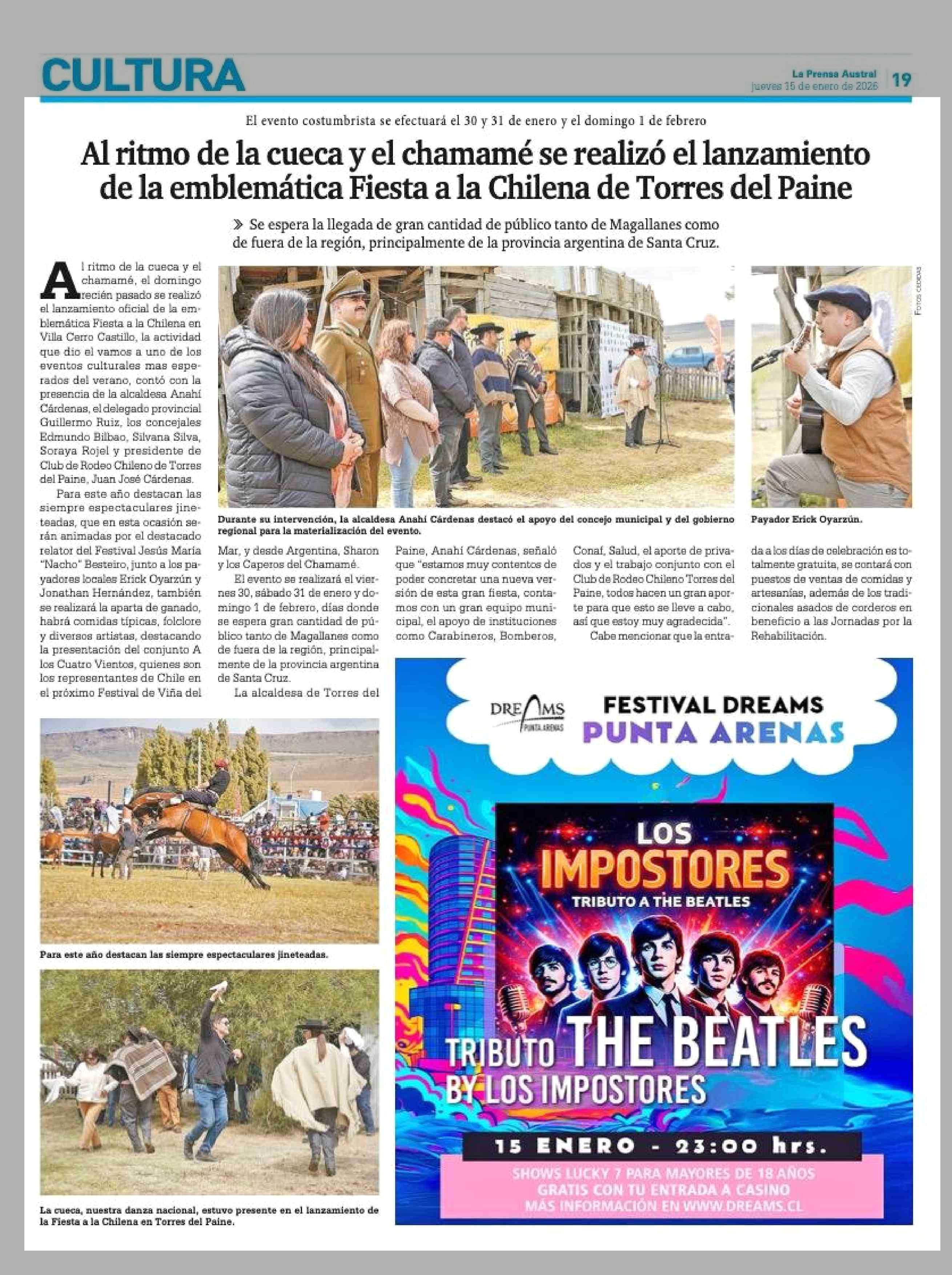 Al ritmo de la cueca y el chamamé se realizó el lanzamiento de la emblemática Fiesta a la Chilena de Torres del Paine 15-01-2026 La Prensa Austral |