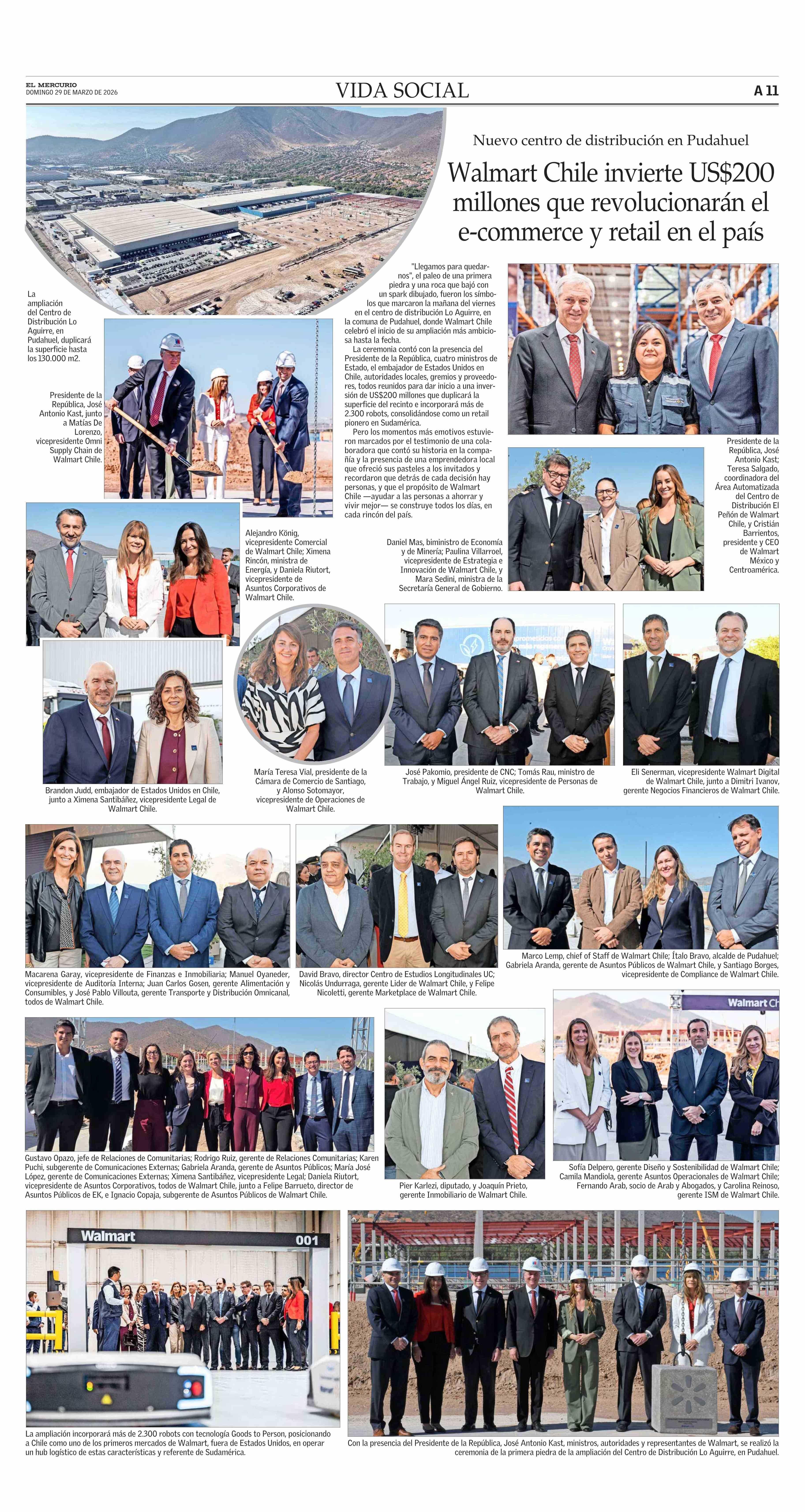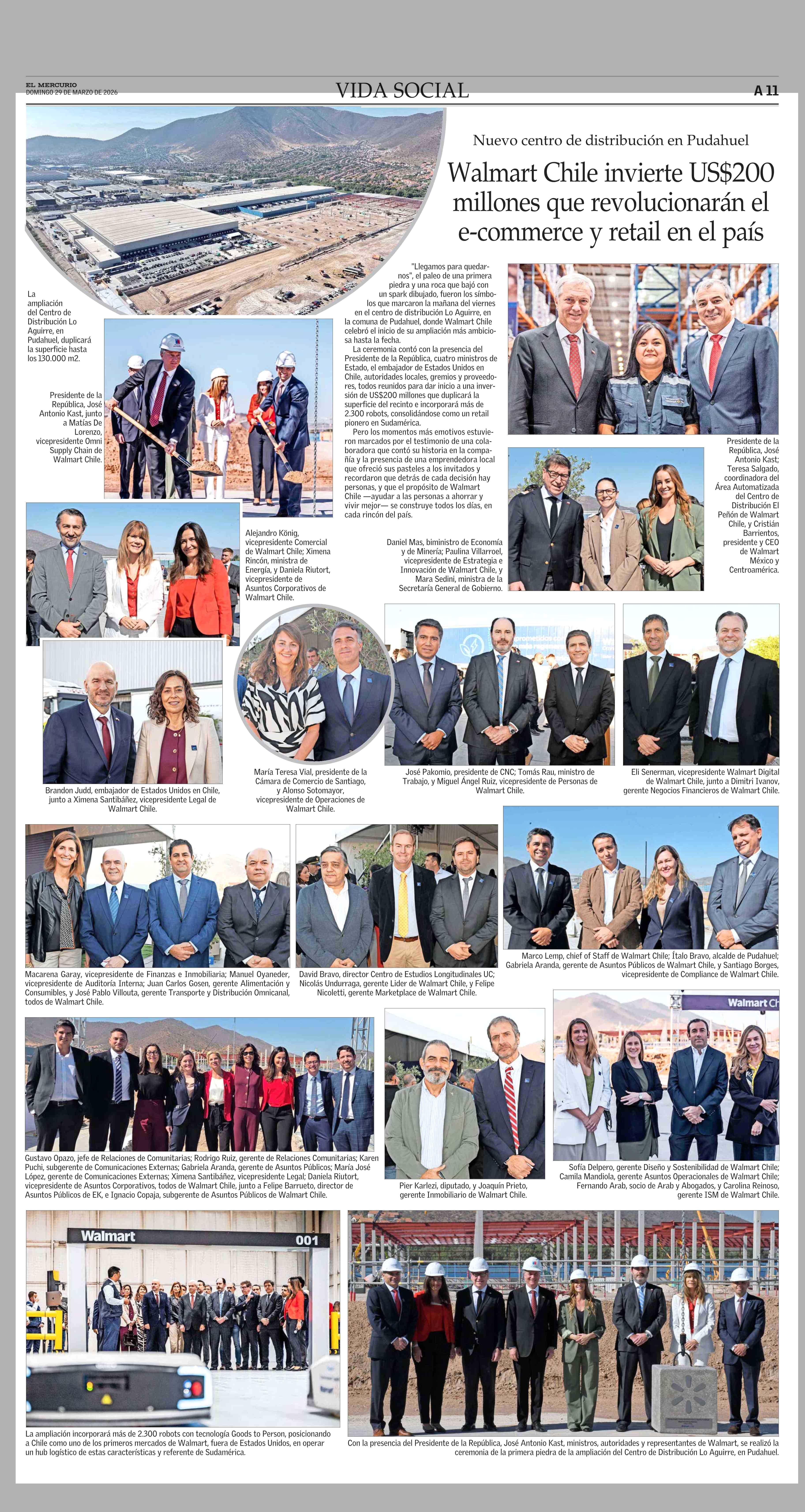 Walmart Chile invierte US$200 millones que revolucionarán el e-commerce y retail en el país 29-03-2026 El Mercurio |