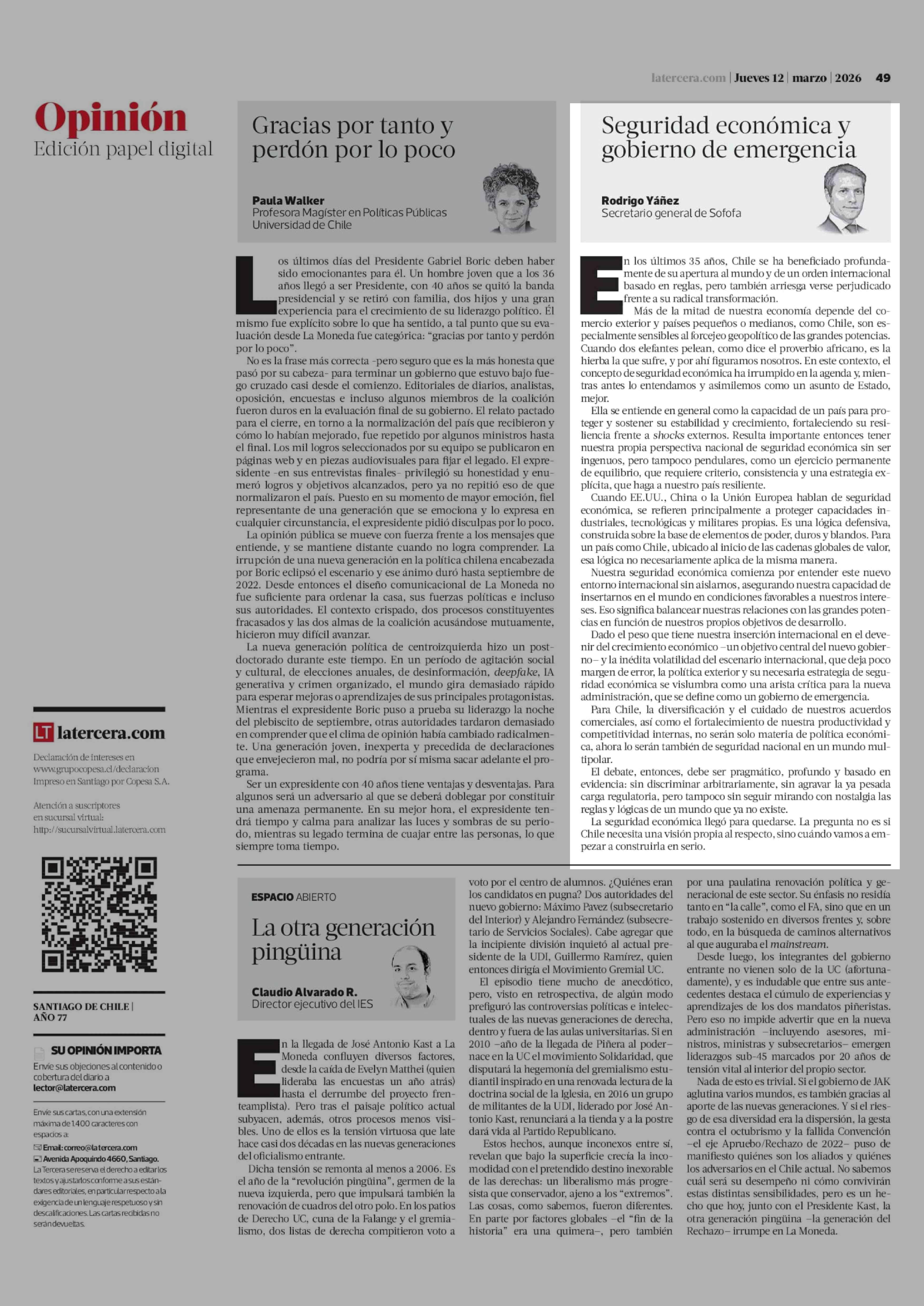 Columnas de Opinión: Seguridad económica y gobierno de emergencia 12-03-2026 La Tercera |