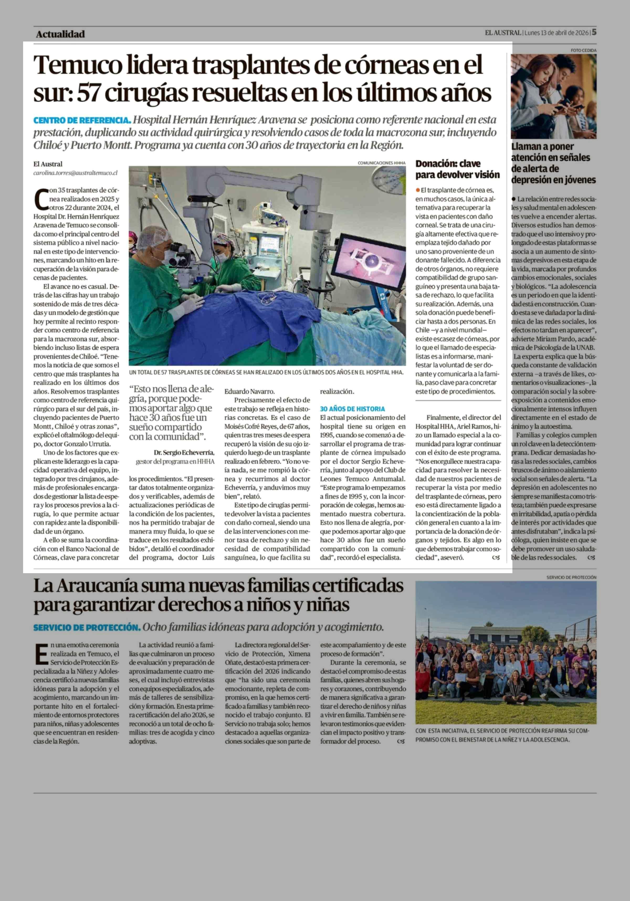 Temuco lidera trasplantes de córneas en el sur: 57 cirugías resueltas en los últimos años 13-04-2026 El Austral de la Araucanía |