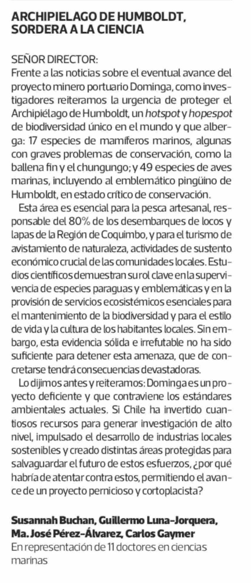 CARTAS: ARCHIPIELAGO DE HUMBOLDT, SORDERA A LA CIENCIA 18-06-2025 La Tercera |