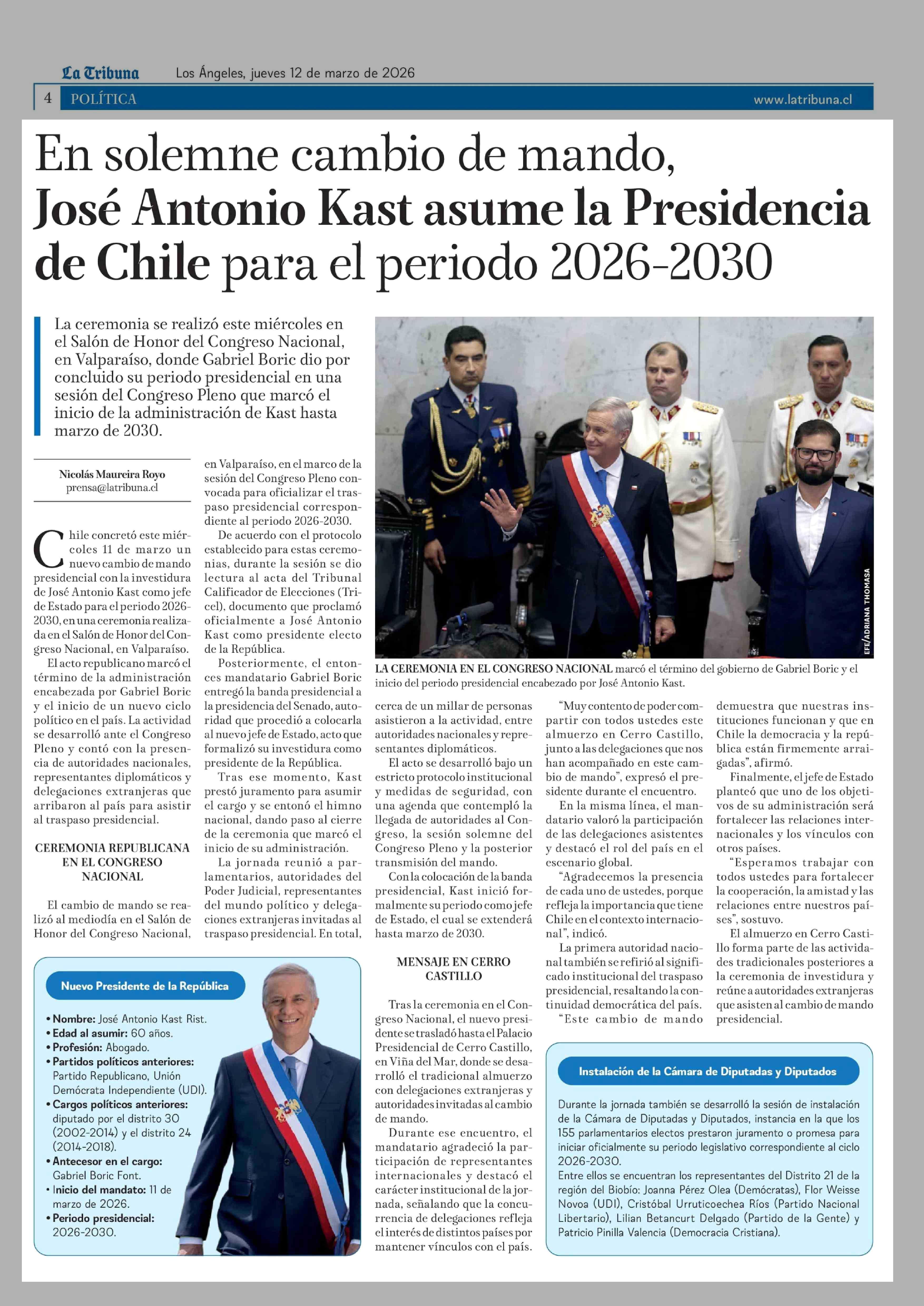 En solemne cambio de mando, José Antonio Kast asume la Presidencia de Chile para el periodo 2026-2030 12-03-2026 La Tribuna |