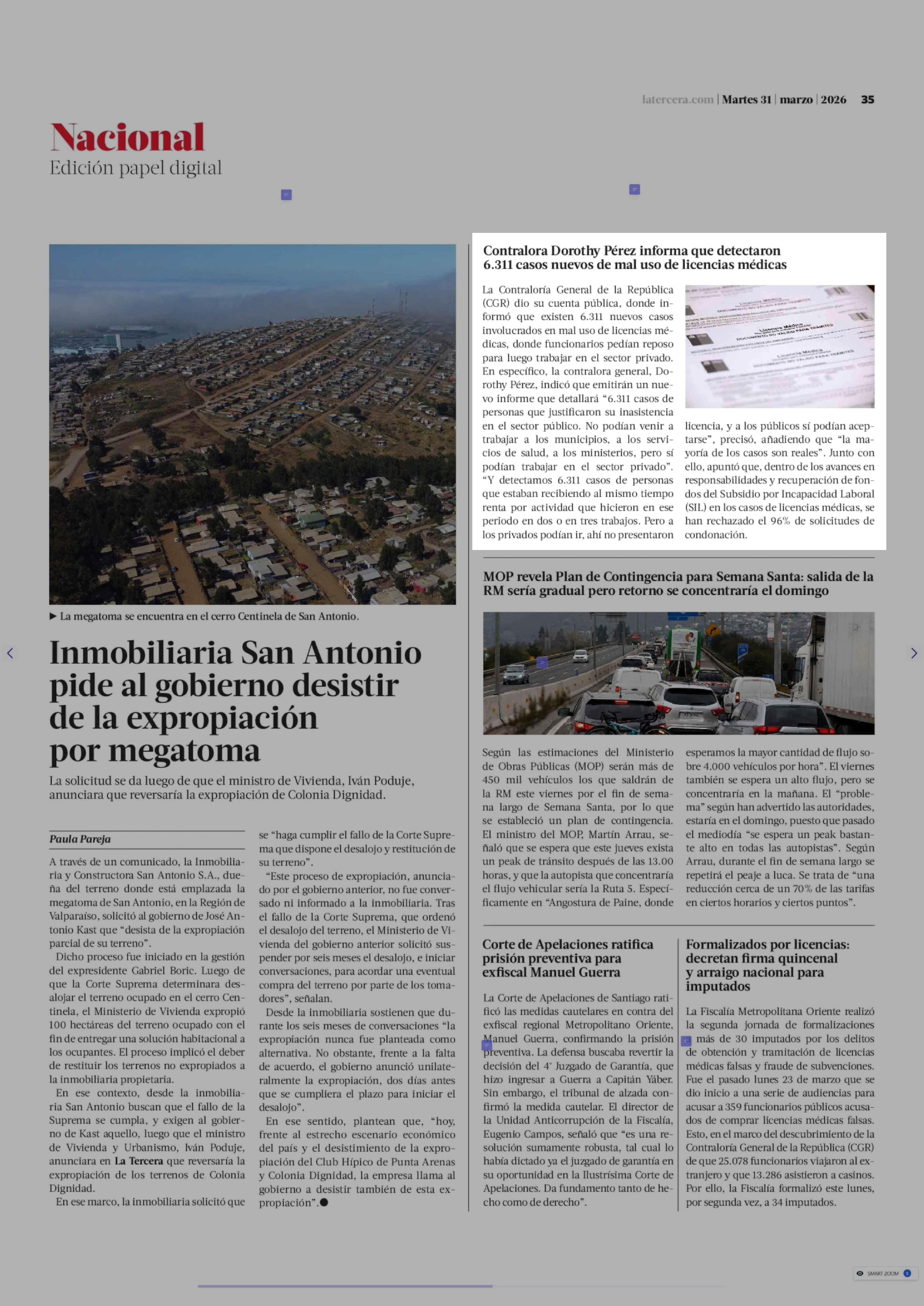 Contralora Dorothy Pérez informa que detectaron 6.311 casos nuevos de mal uso de licencias médicas 31-03-2026 La Tercera |
