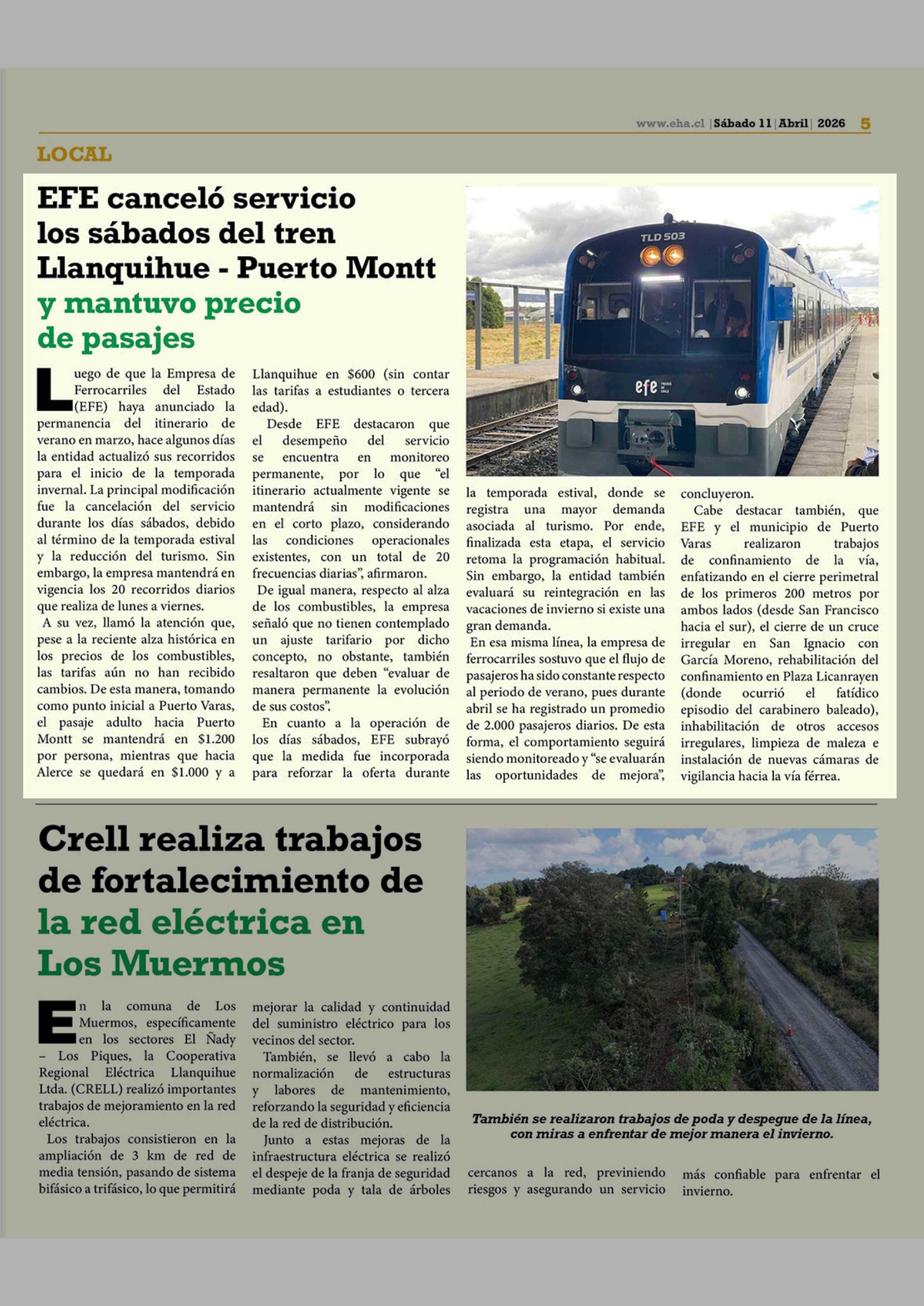 EFE canceló servicio los sábados del tren Llanquihue - Puerto Montt y mantuvo precio de pasajes 11-04-2026 El Heraldo Austral |