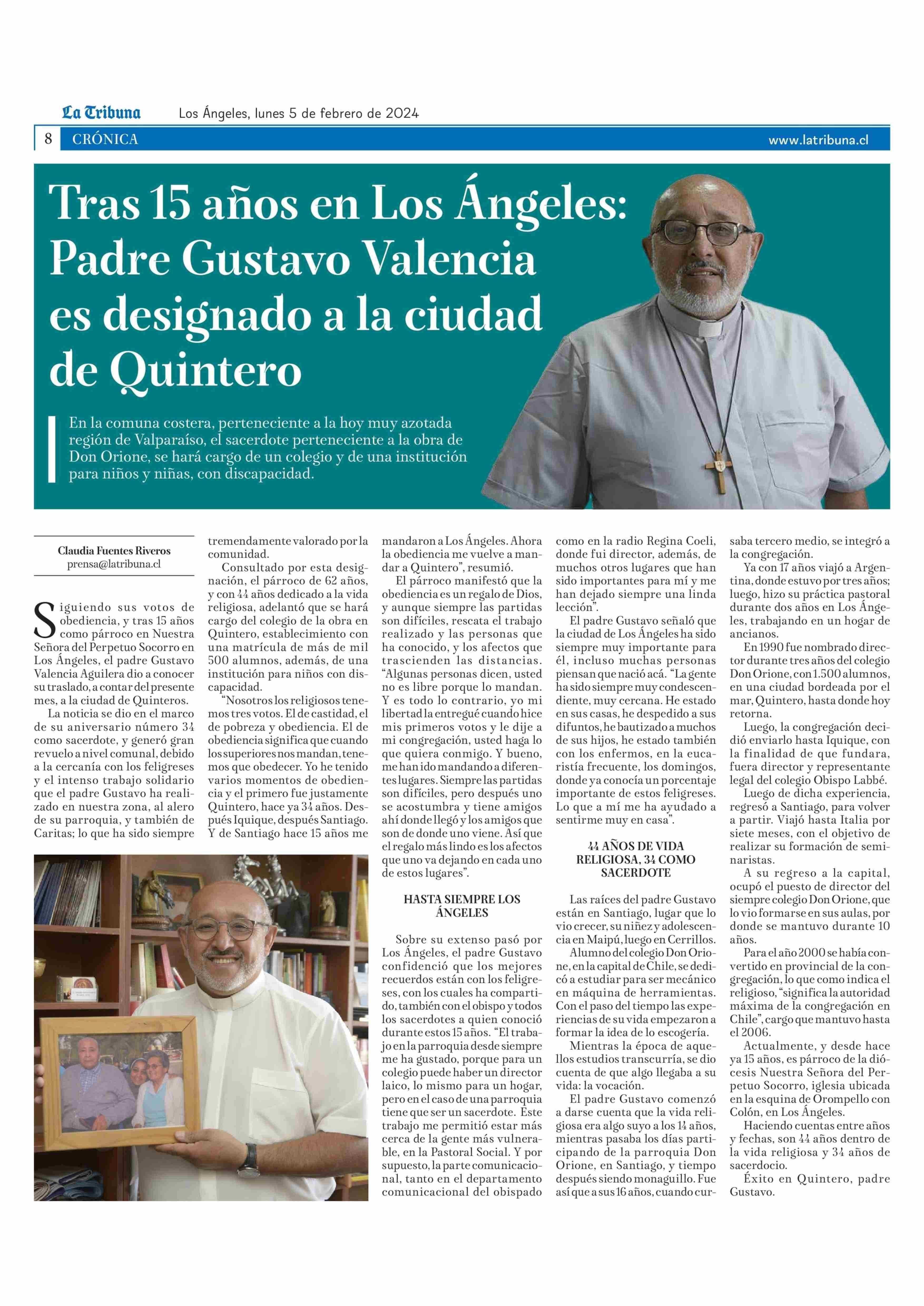 Tras 15 años en Los Ángeles: Padre Gustavo Valencia es designado a la ciudad de Quintero 05-02-2024 La Tribuna |