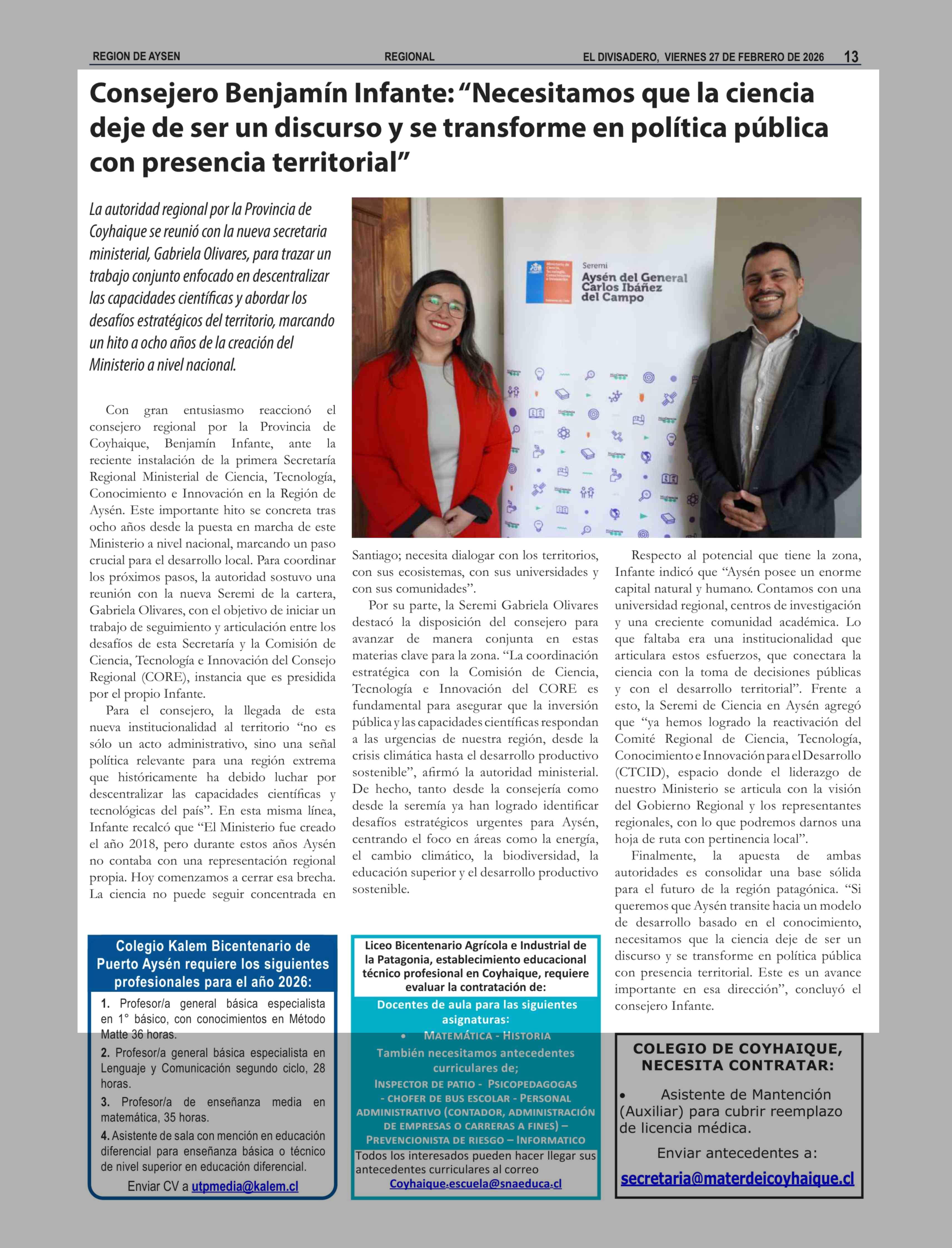 Consejero Benjamín Infante: "Necesitamos que la ciencia deje de ser un discurso y se transforme en política pública con presencia territorial" 27-02-2026 El Divisadero |