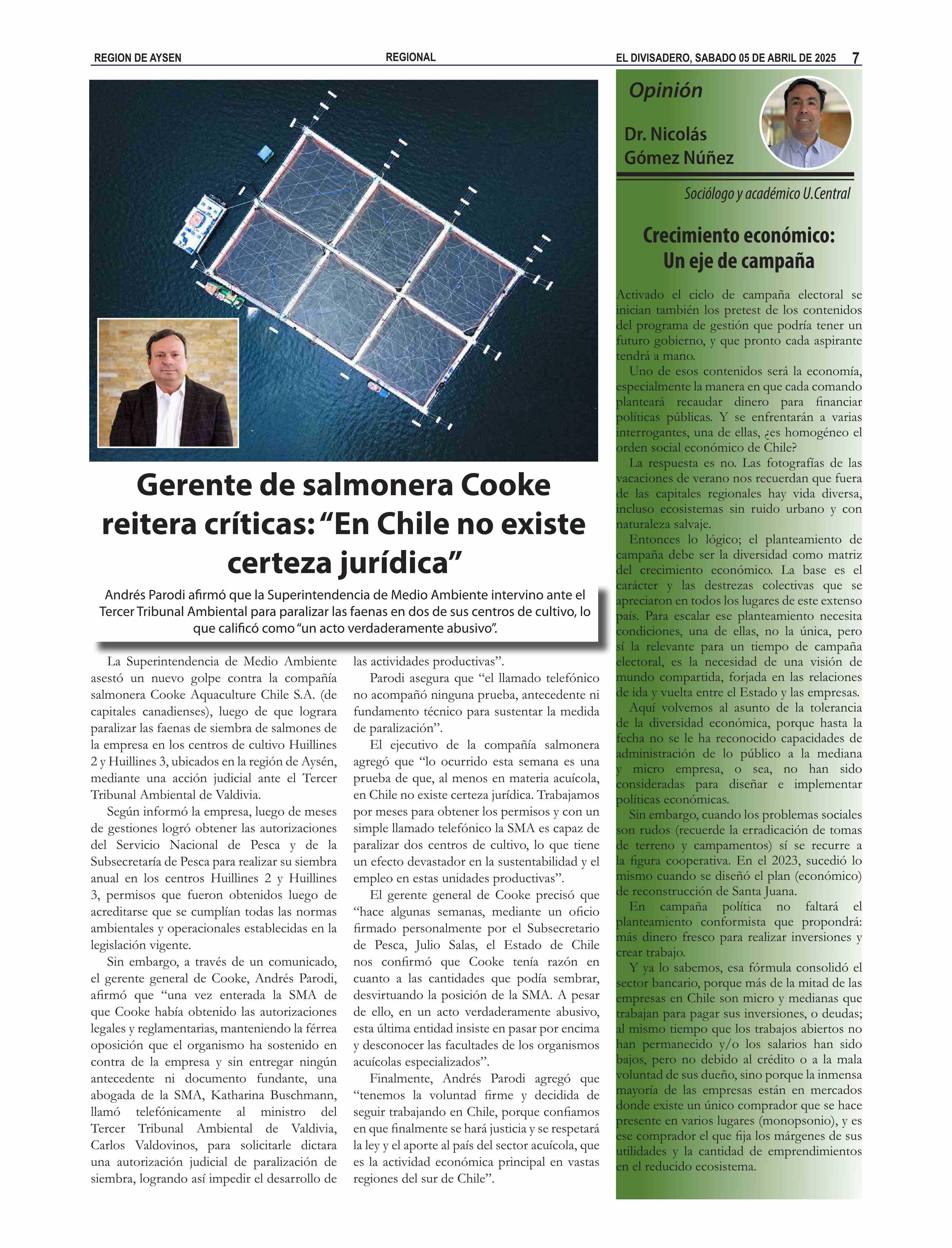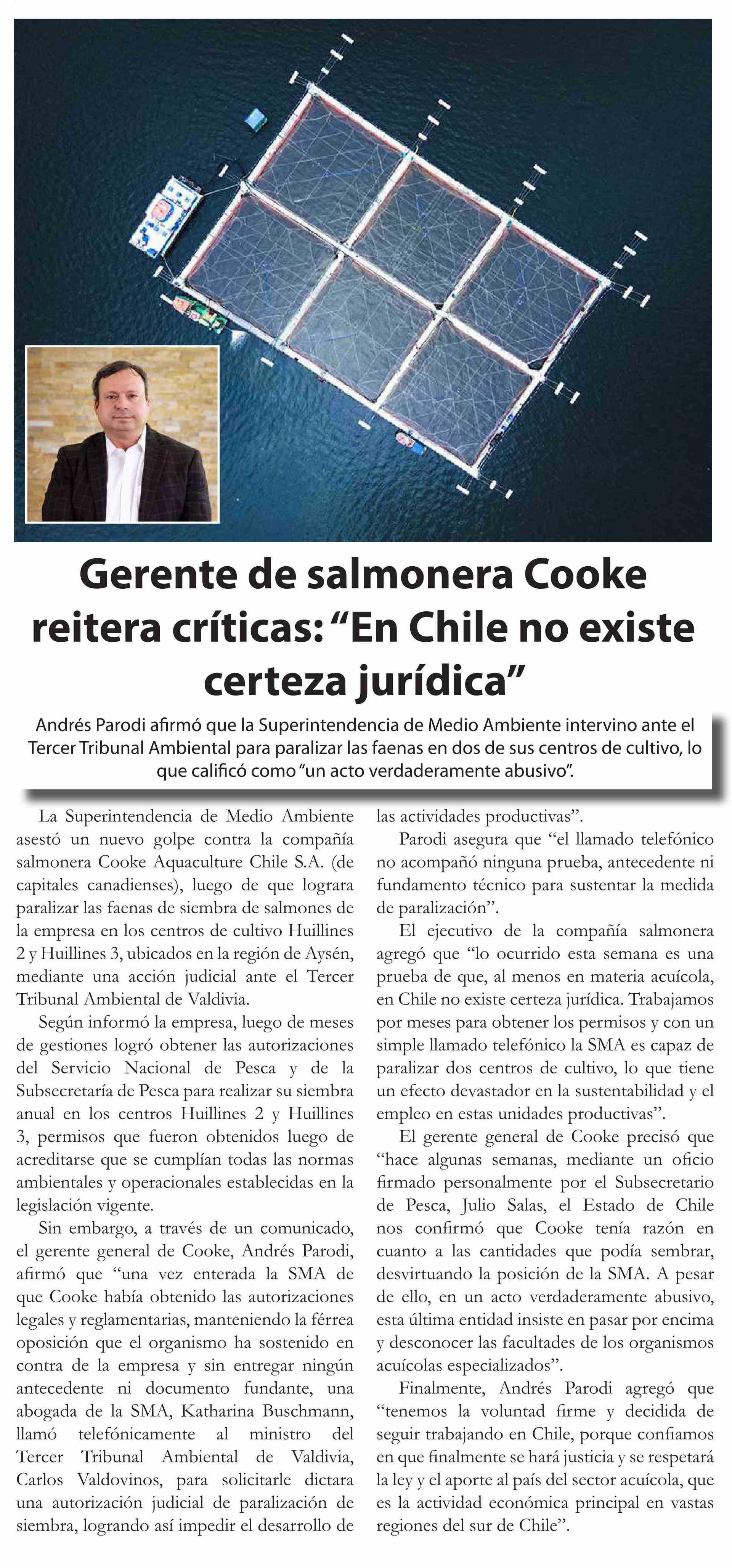 Gerente de salmonera Cooke reitera críticas: “En Chile no existe certeza jurídica” 05-04-2025 El Divisadero |
