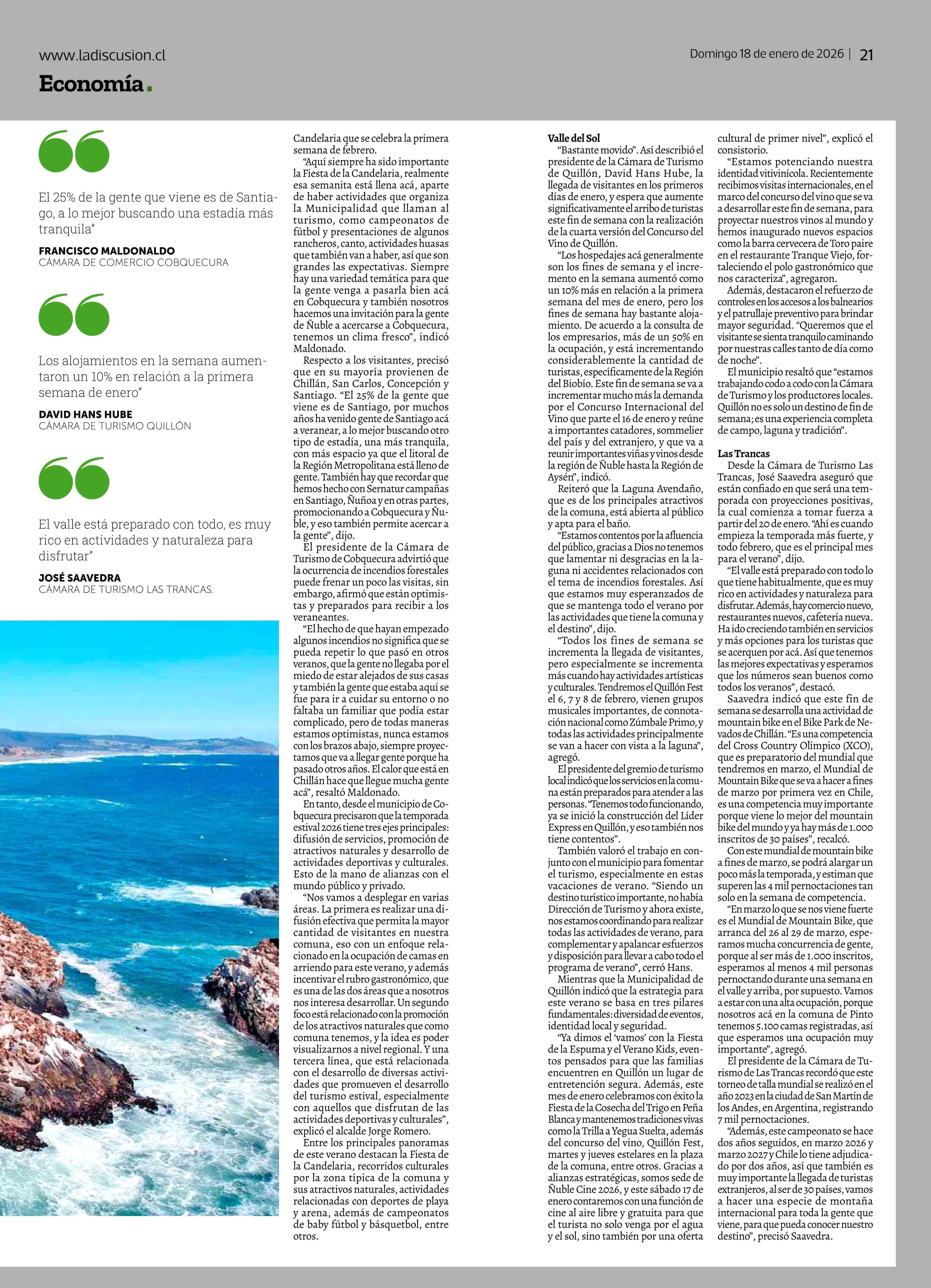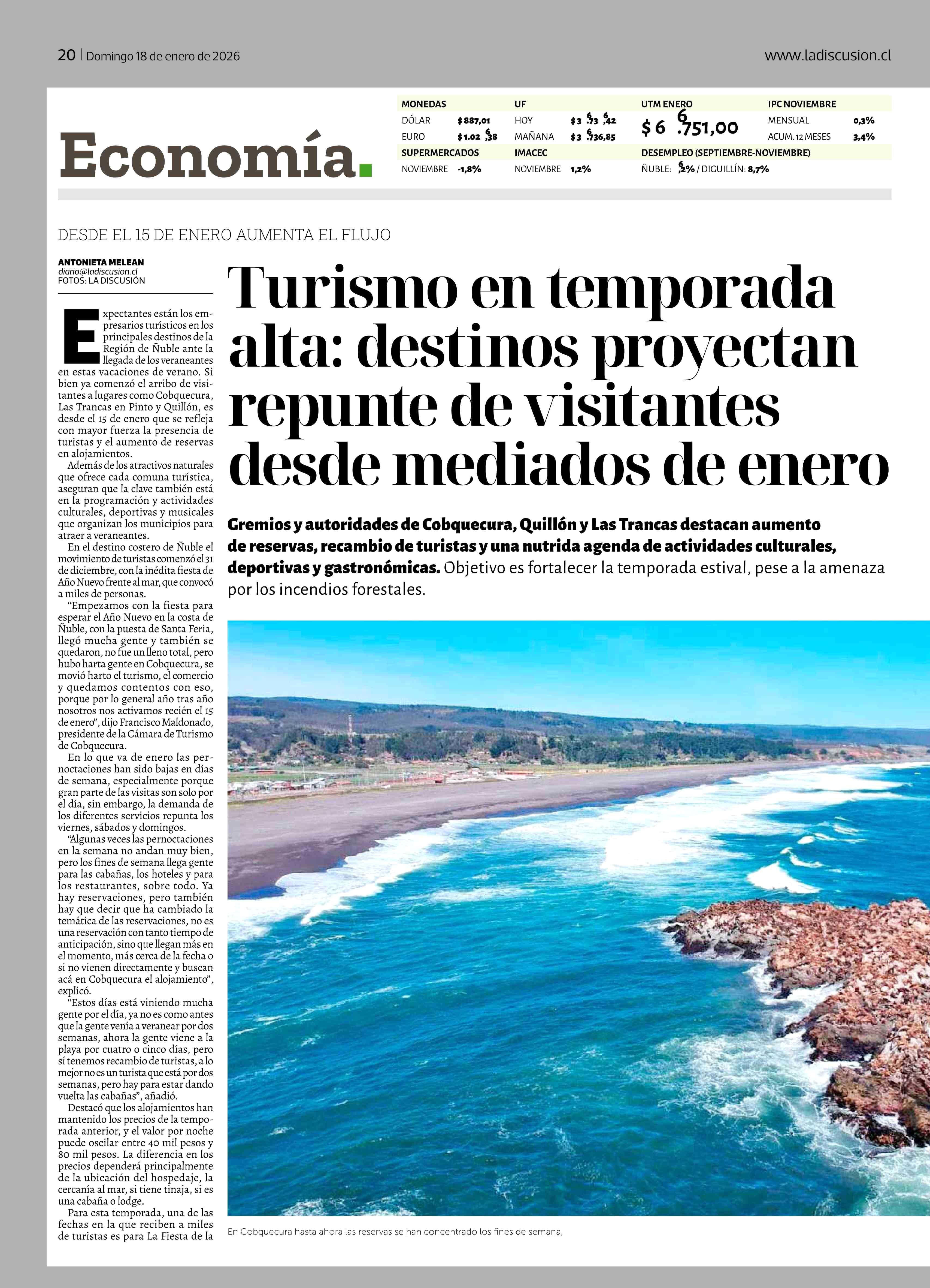 Turismo en temporada alta: destinos proyectan repunte de visitantes desde mediados de enero 18-01-2026 La Discusión |