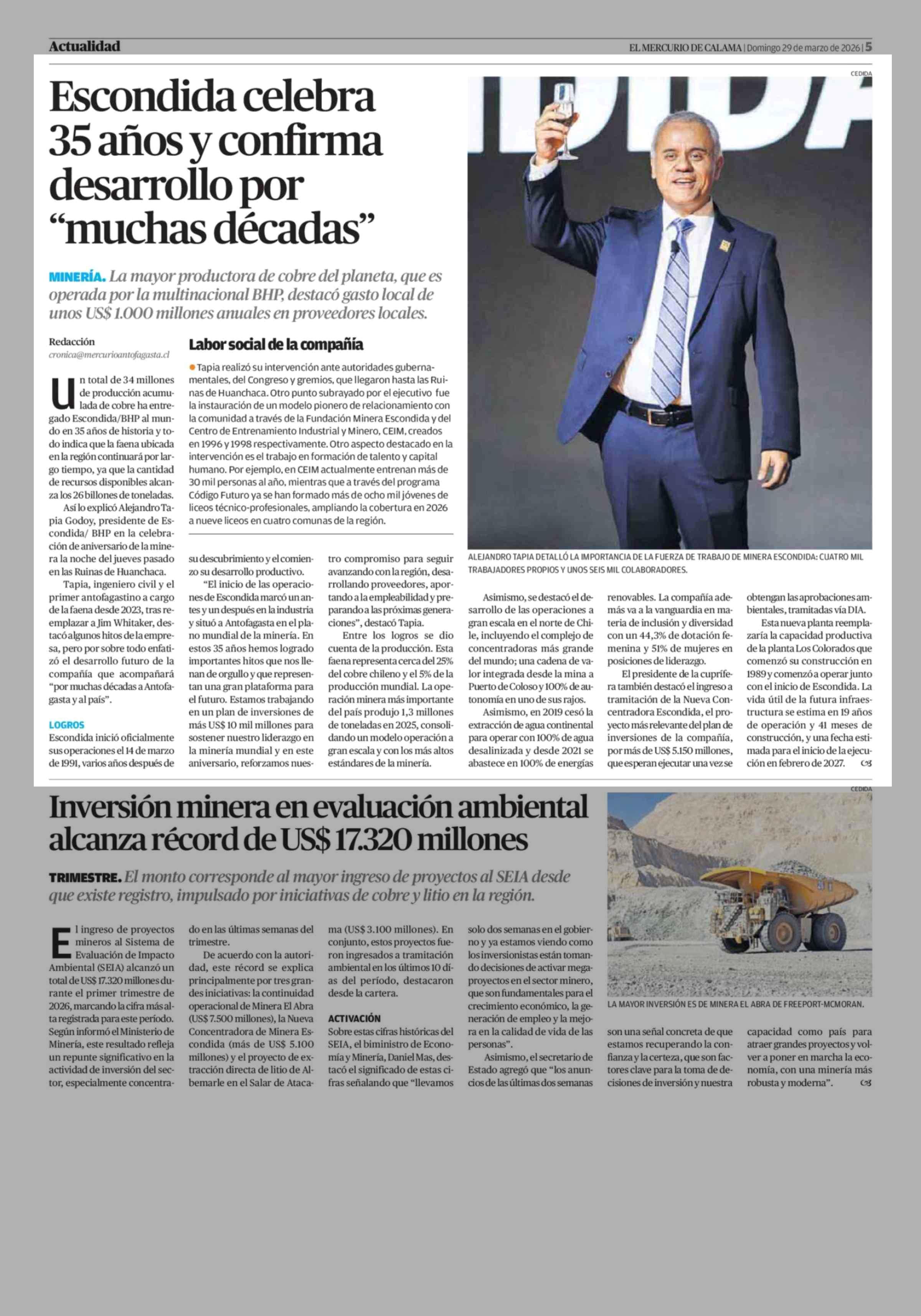Escondida celebra 35 años y confirma desarrollo por "muchas décadas" 29-03-2026 El Mercurio de Calama |