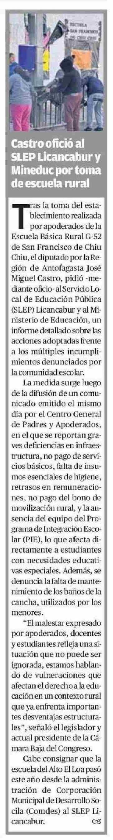 Castro ofició al SLEP Licancabur y Mineduc por toma de escuela rural 05-06-2025 El Mercurio de Calama |