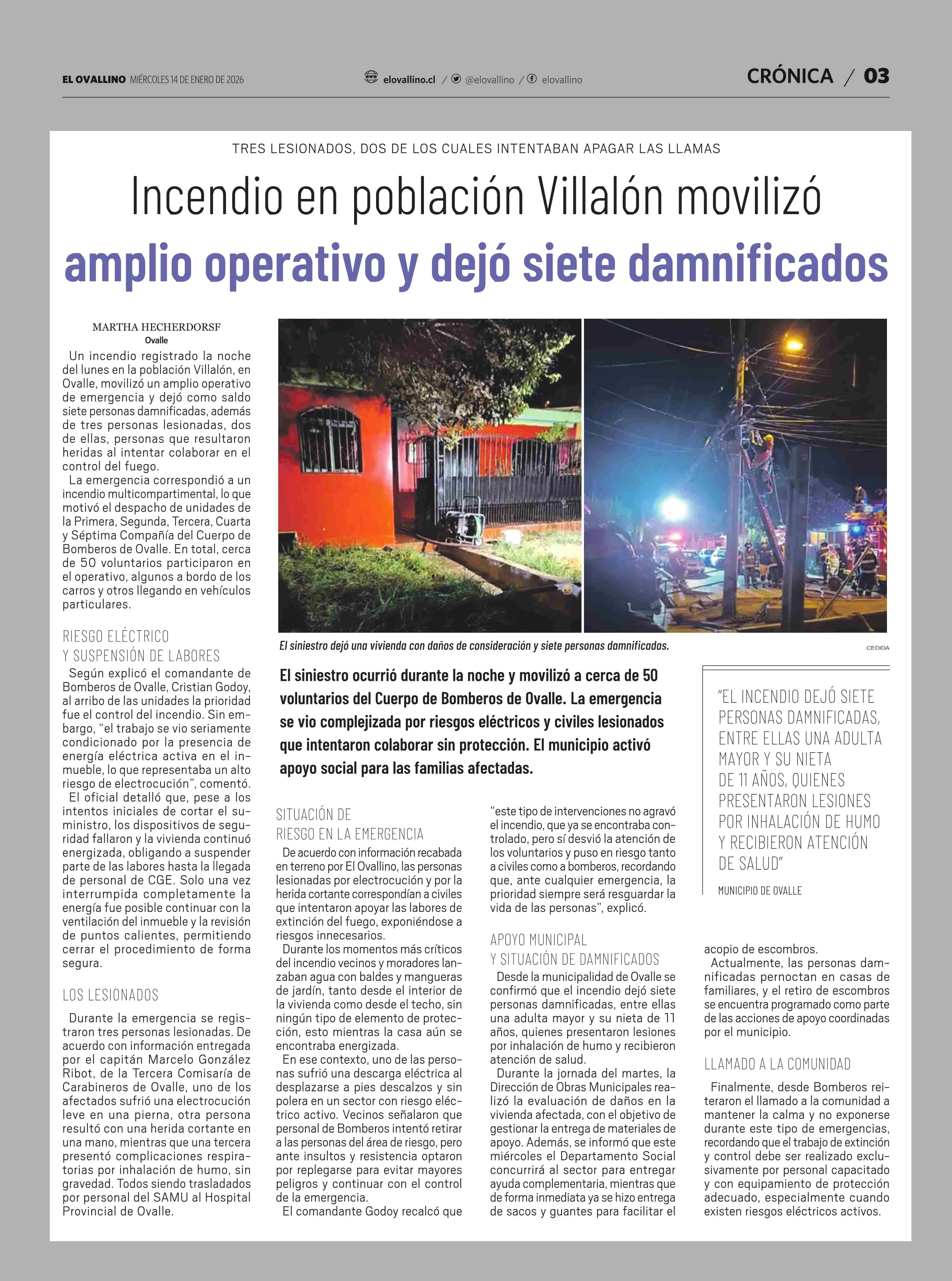 Incendio en población Villalón movilizó amplio operativo y dejó siete damnificados 14-01-2026 El Ovallino |