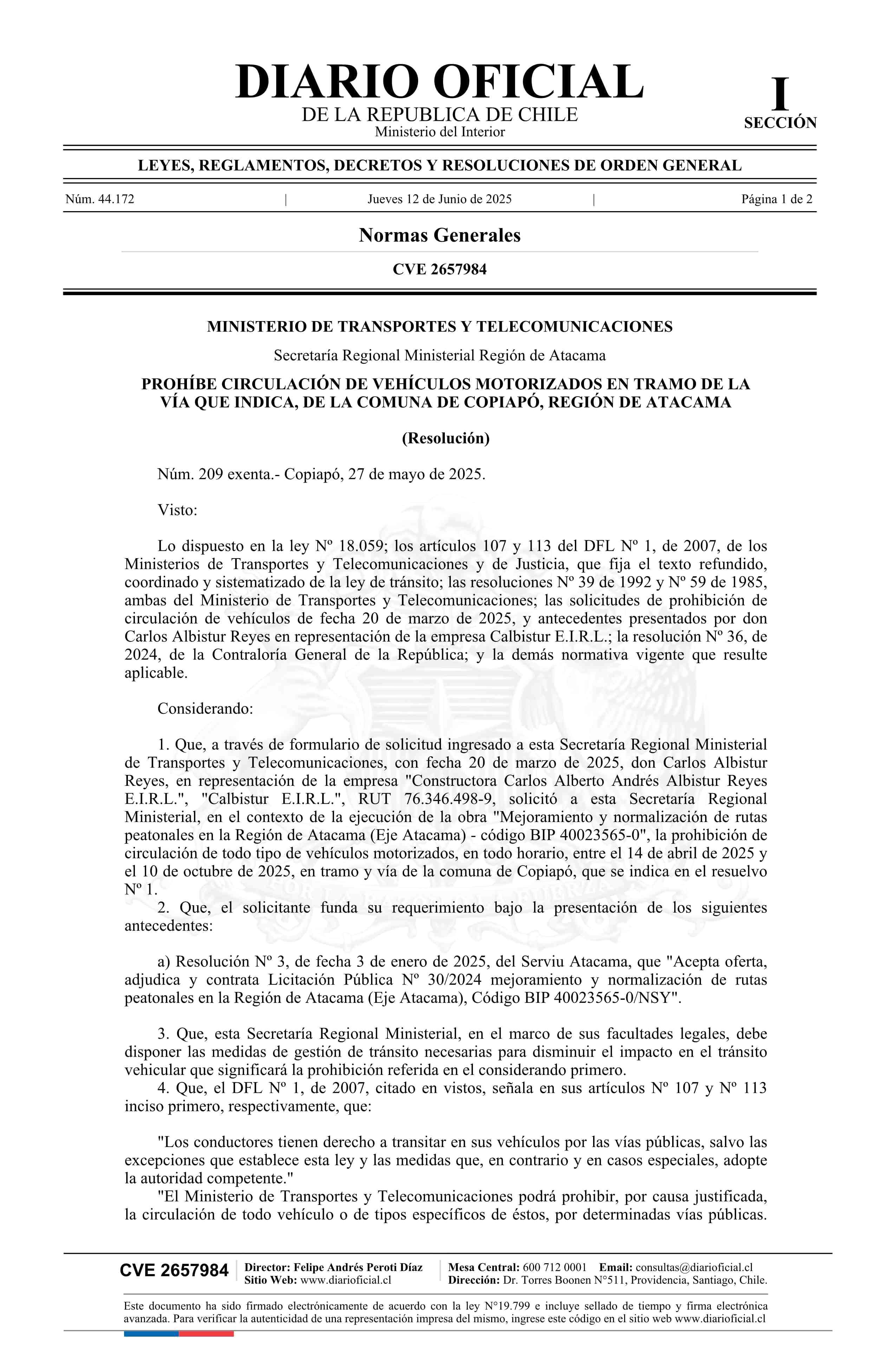 | Título: | Resolución exenta número 209, de 2025.- Prohíbe circulación de vehículos motorizados en tramo de la vía que indica, de la comuna de Copiapó, Región de Atacama |