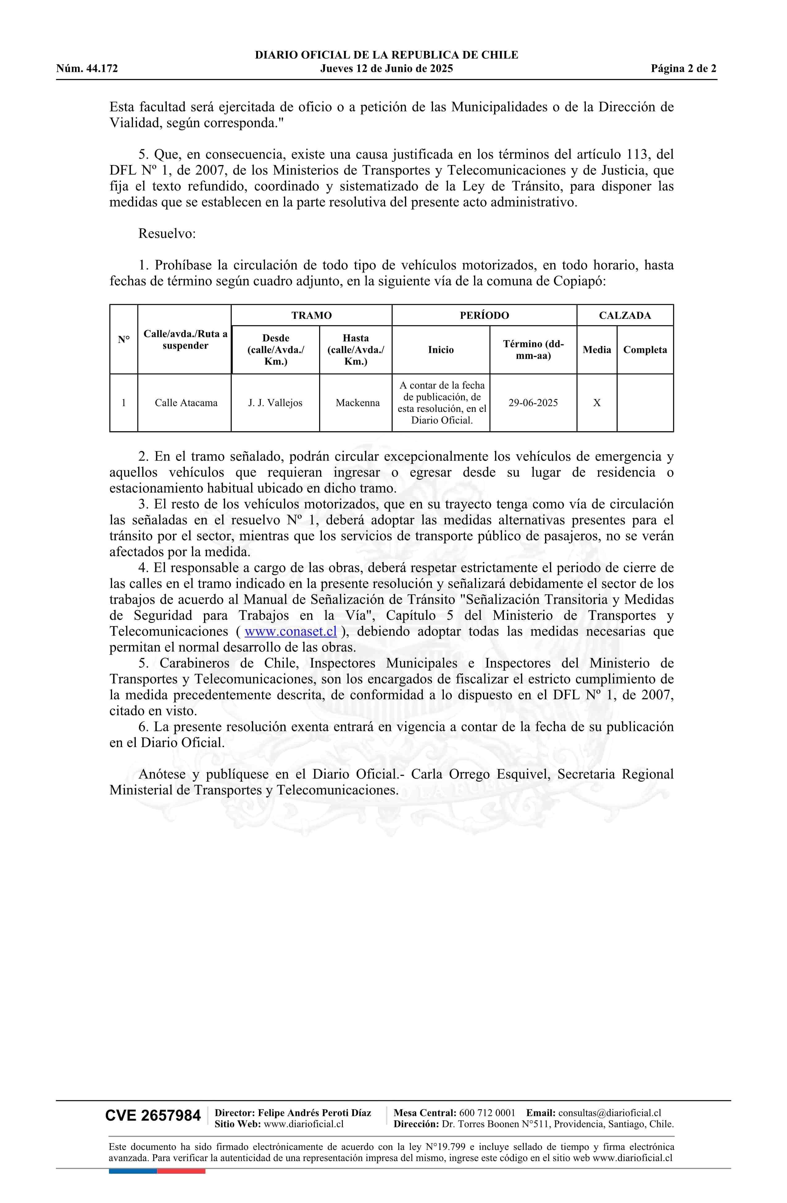 Resolución exenta número 209, de 2025.- Prohíbe circulación de vehículos motorizados en tramo de la vía que indica, de la comuna de Copiapó, Región de Atacama 12-06-2025 DIARIO OFICIAL CHILE - BOLETÍN OFICIAL DE MINERÍA |