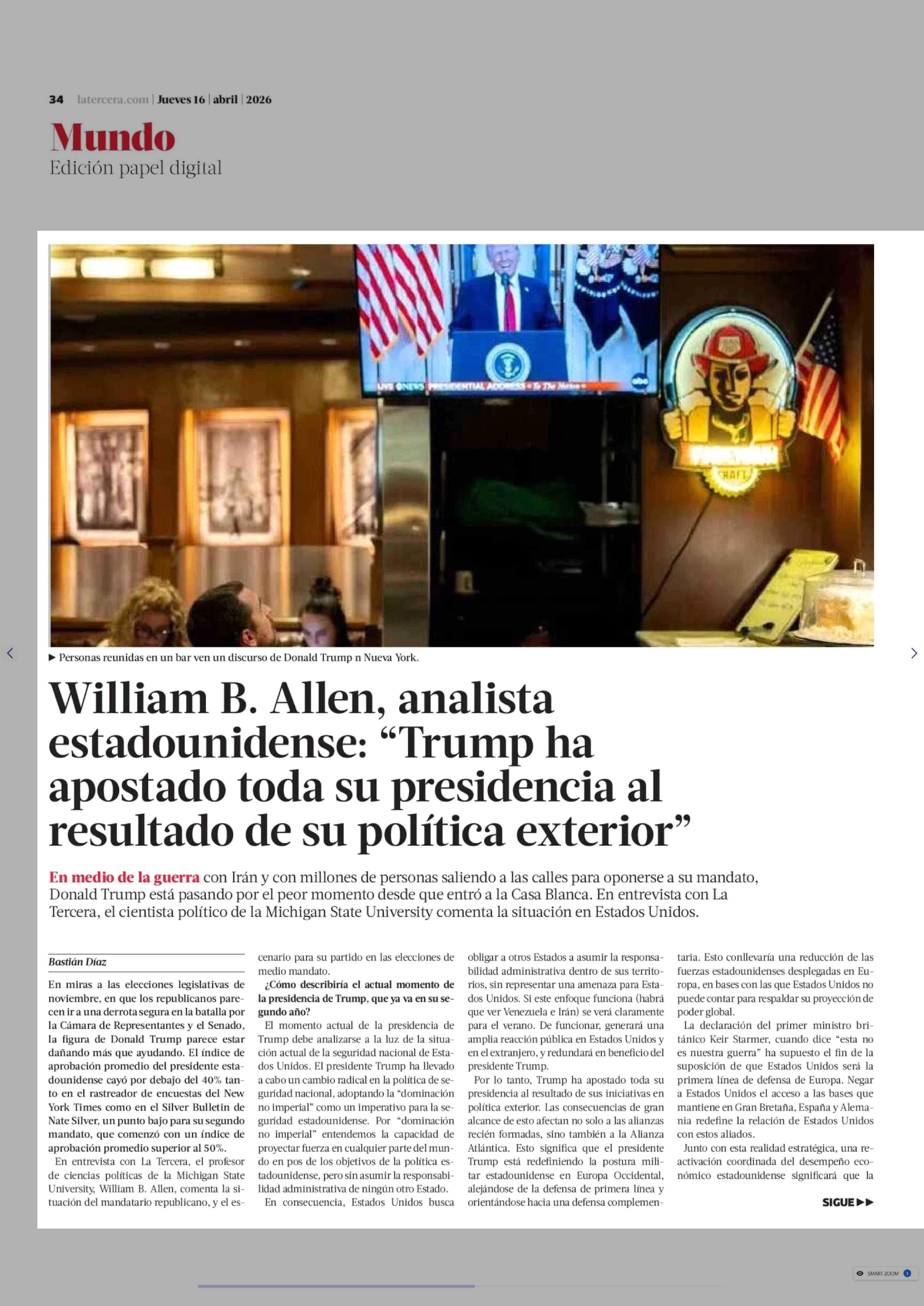 William B. Allen, analista estadounidense: "Trump ha apostado toda su presidencia al resultado de su política exterior" 16-04-2026 La Tercera |