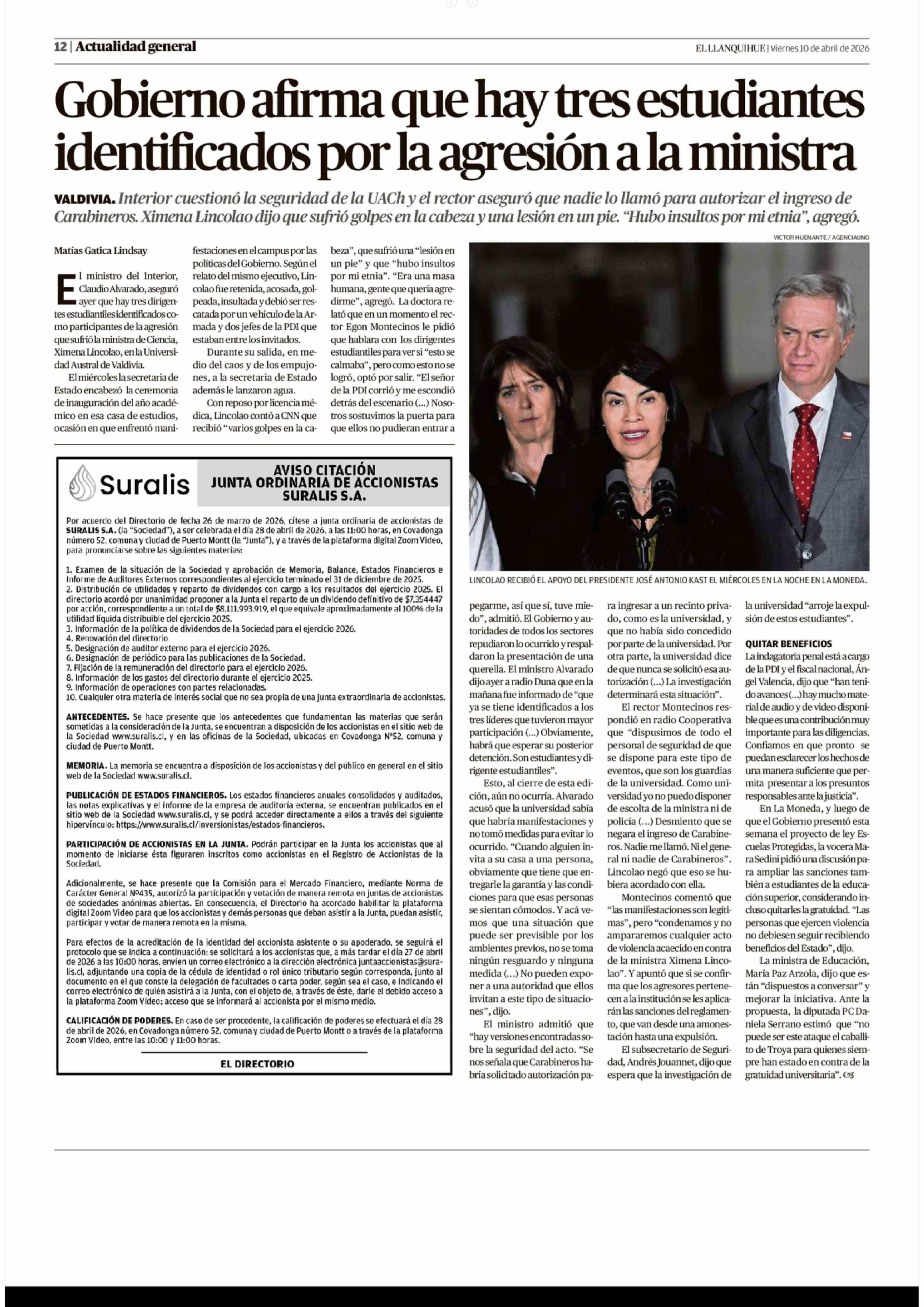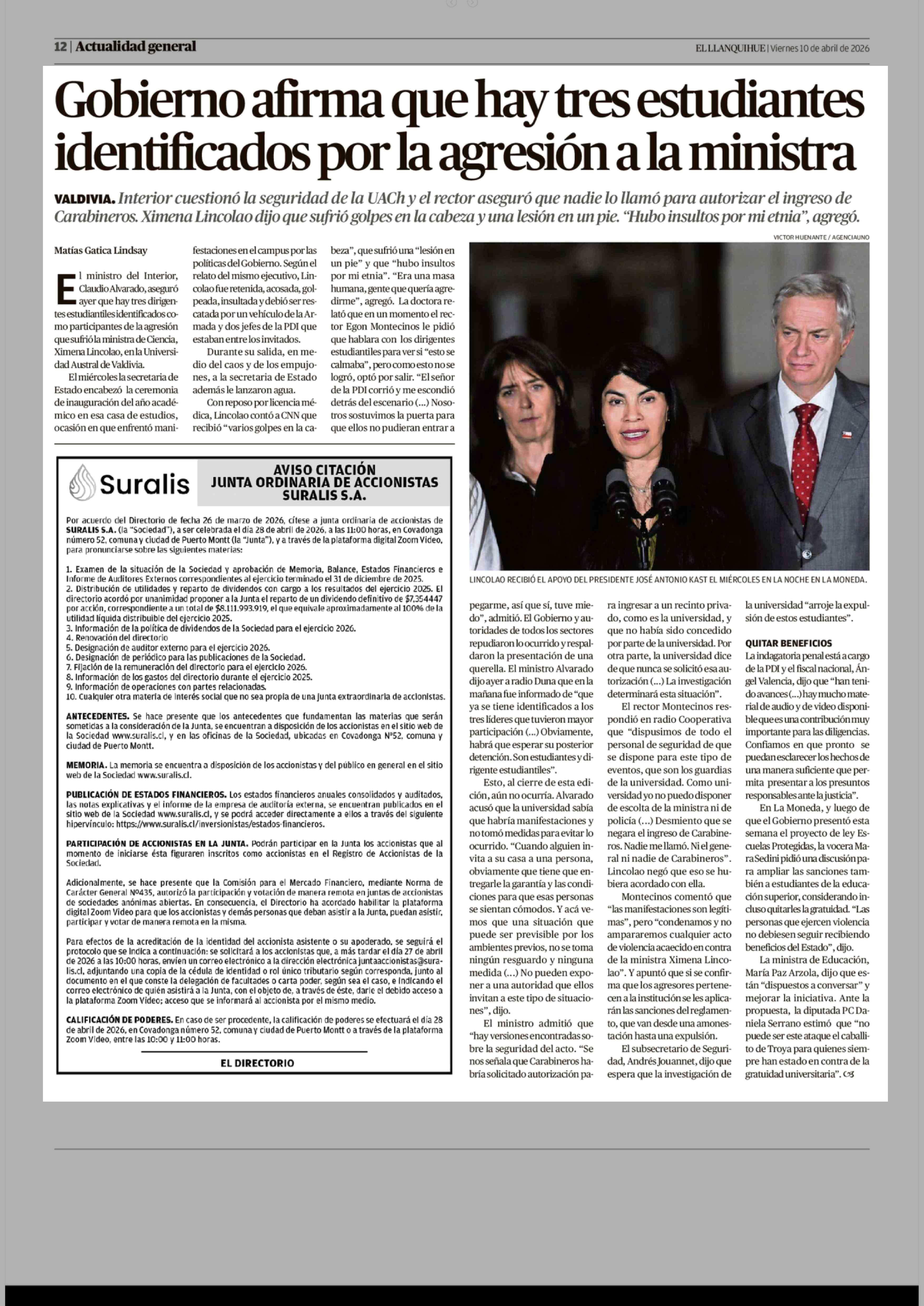 Gobierno afirma que hay tres estudiantes identificados por la agresión a la ministra 10-04-2026 El Llanquihue |