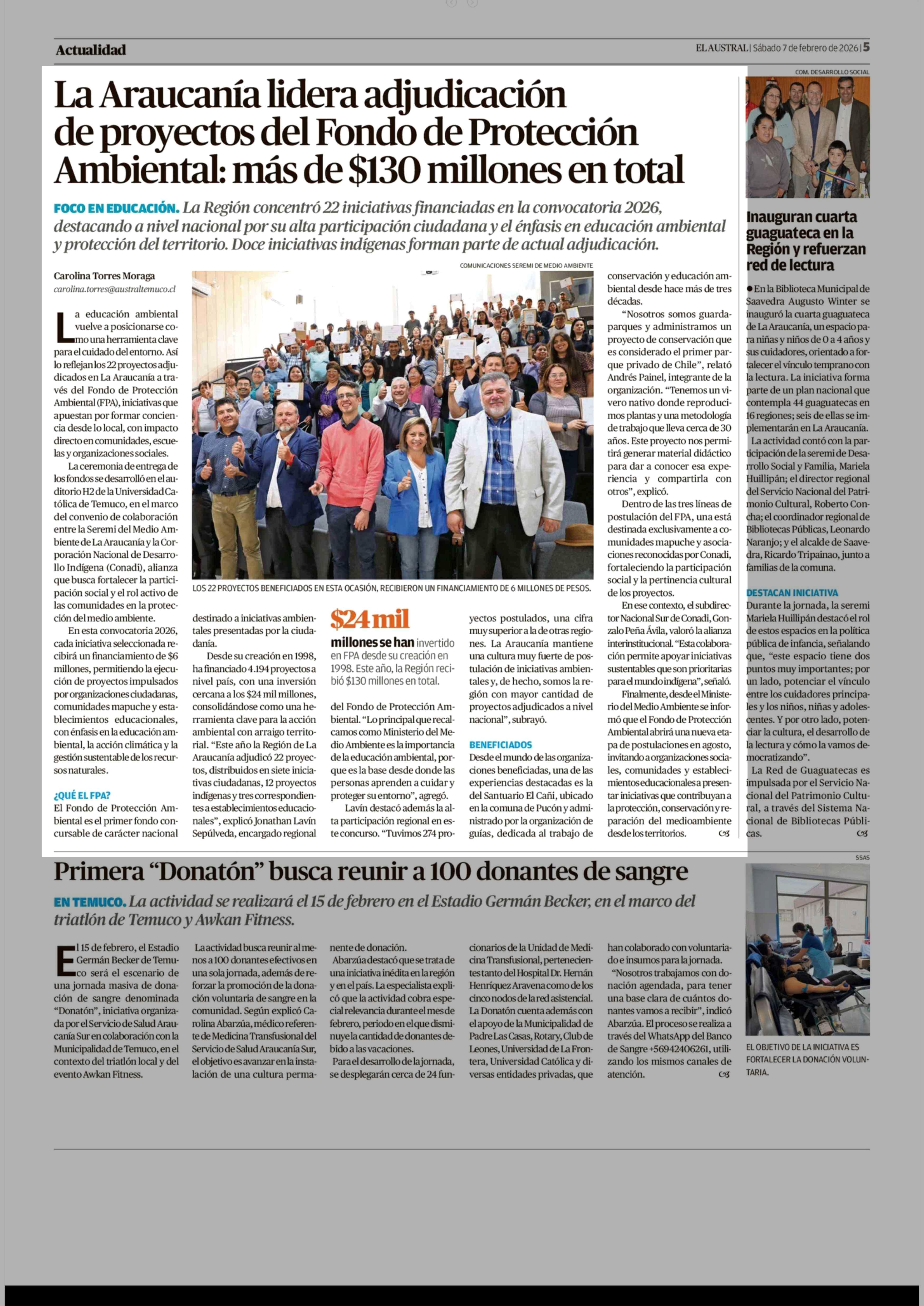 La Araucanía lidera adjudicación de proyectos del Fondo de Protección Ambiental: más de $130 millones en total 07-02-2026 El Austral de la Araucanía |