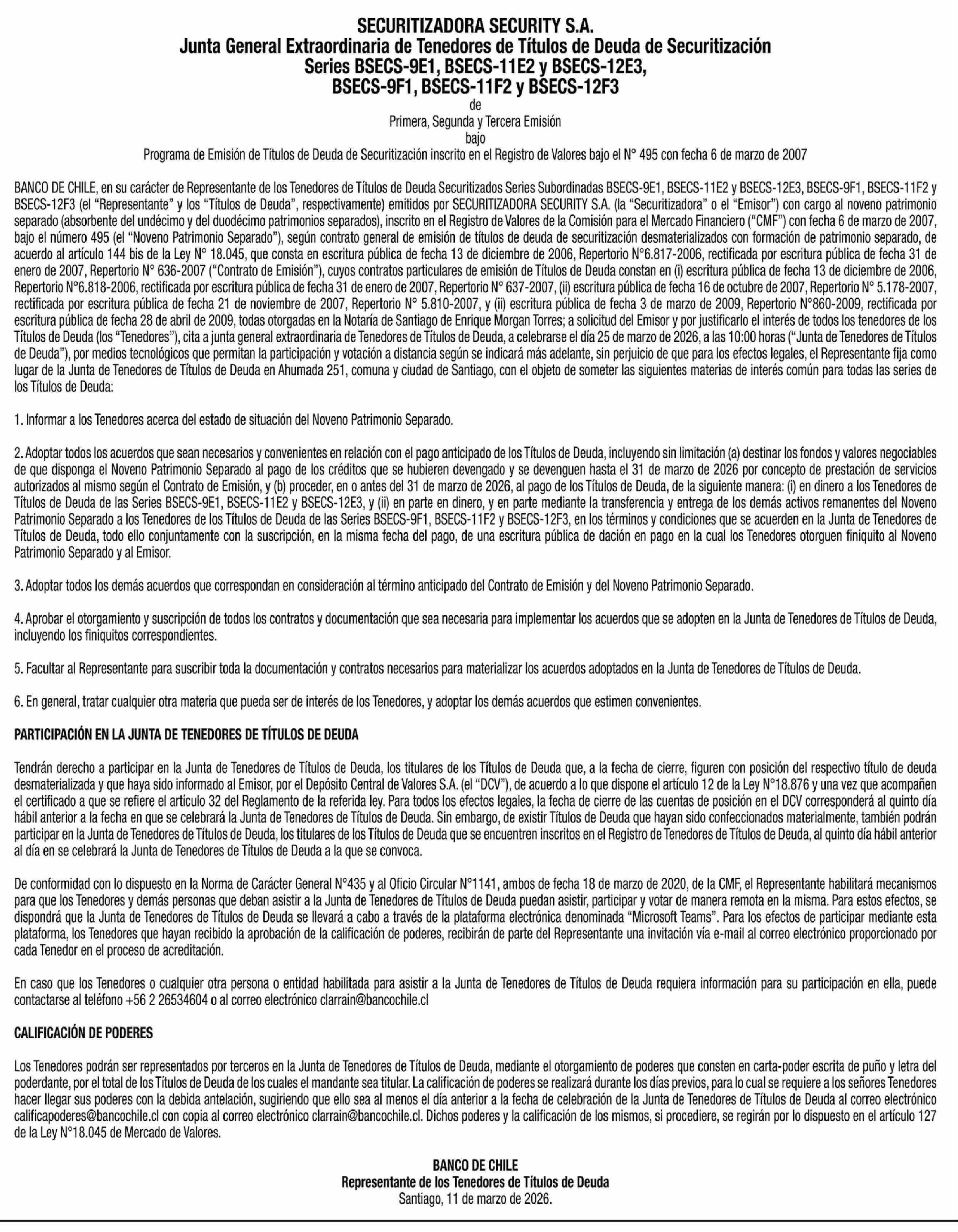 SECURITIZADORA SECURITY S.A. 11-03-2026 La Segunda |