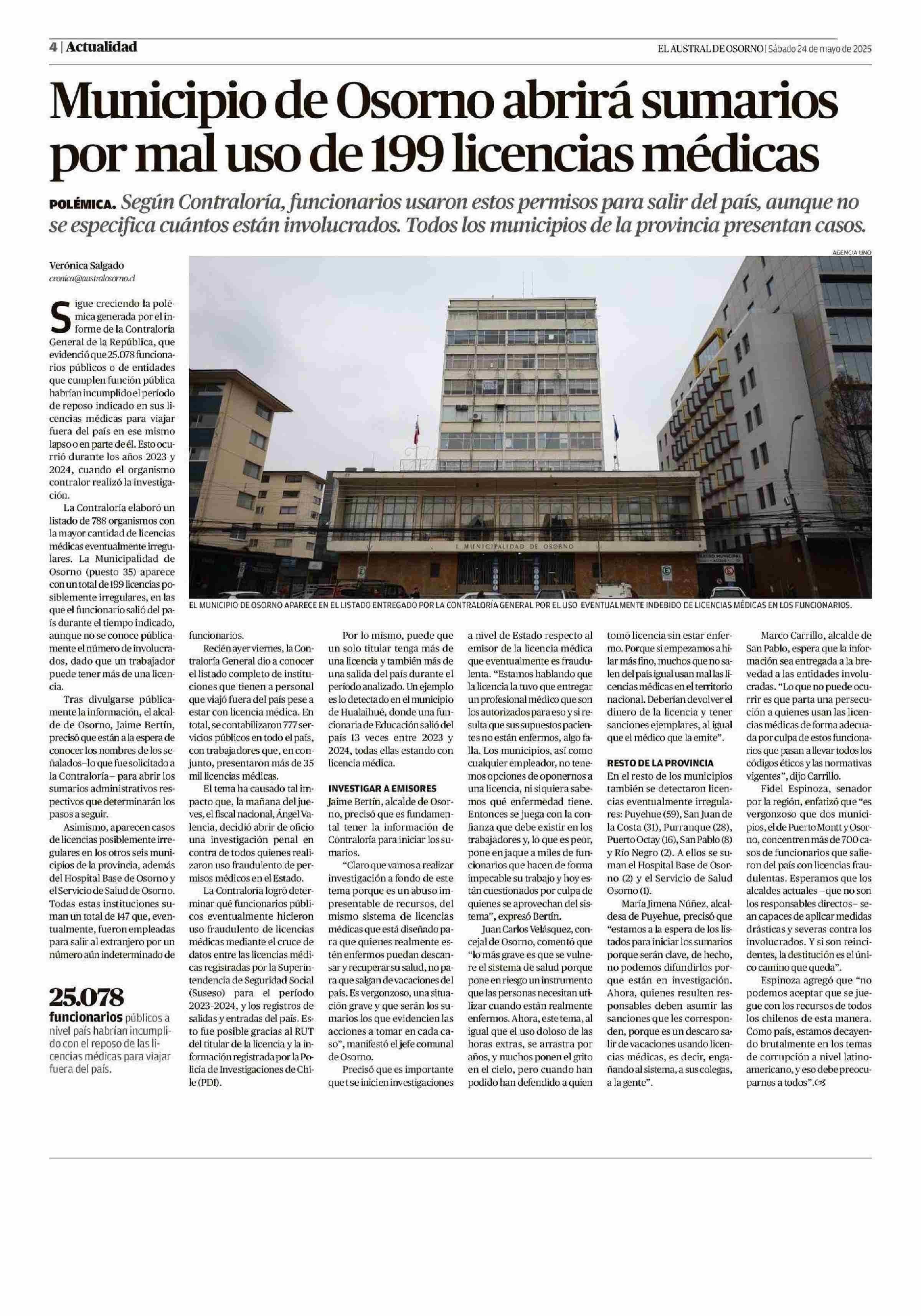 Municipio de Osorno abrirá sumarios por mal uso de 199 licencias médicas 24-05-2025 El Austral de Osorno |