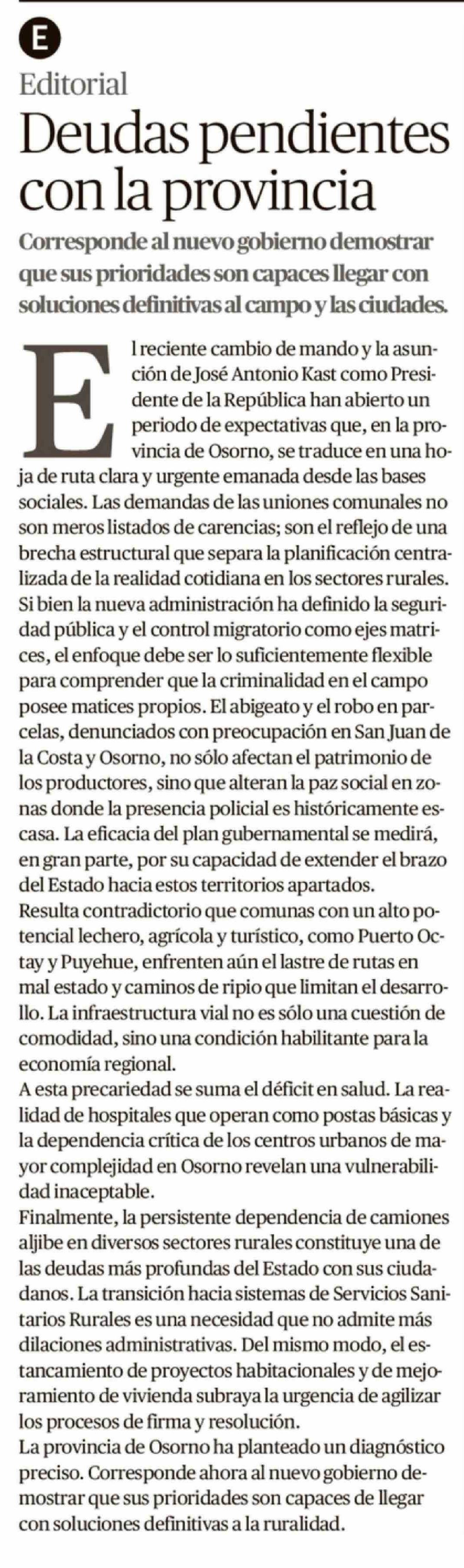 Editorial: Deudas pendientes con la provincia 13-03-2026 El Austral de Osorno |