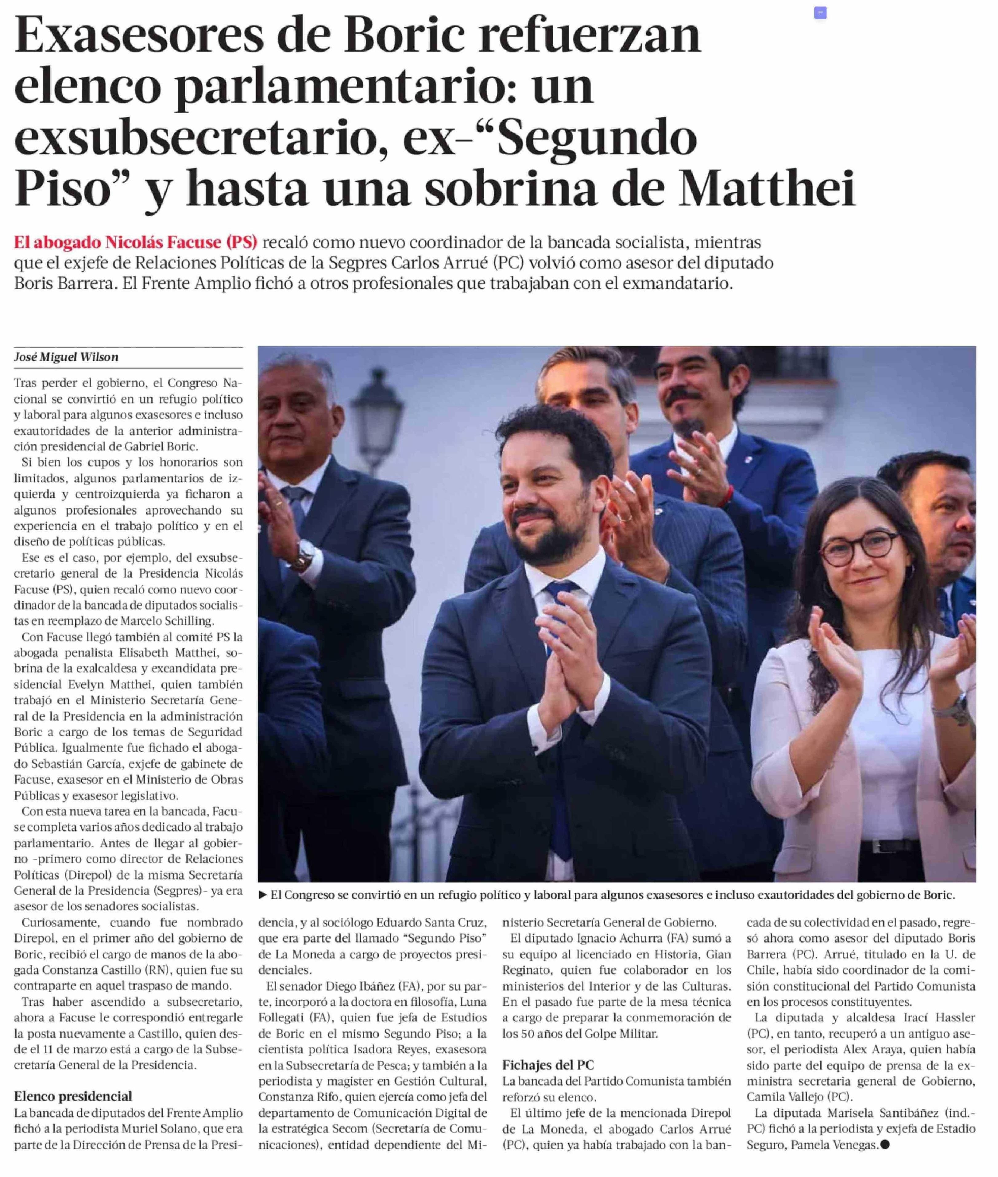 Exasesores de Boric refuerzan elenco parlamentario: un exsubsecretario, ex-"Segundo Piso" y hasta una sobrina de Matthei 03-04-2026 La Tercera |