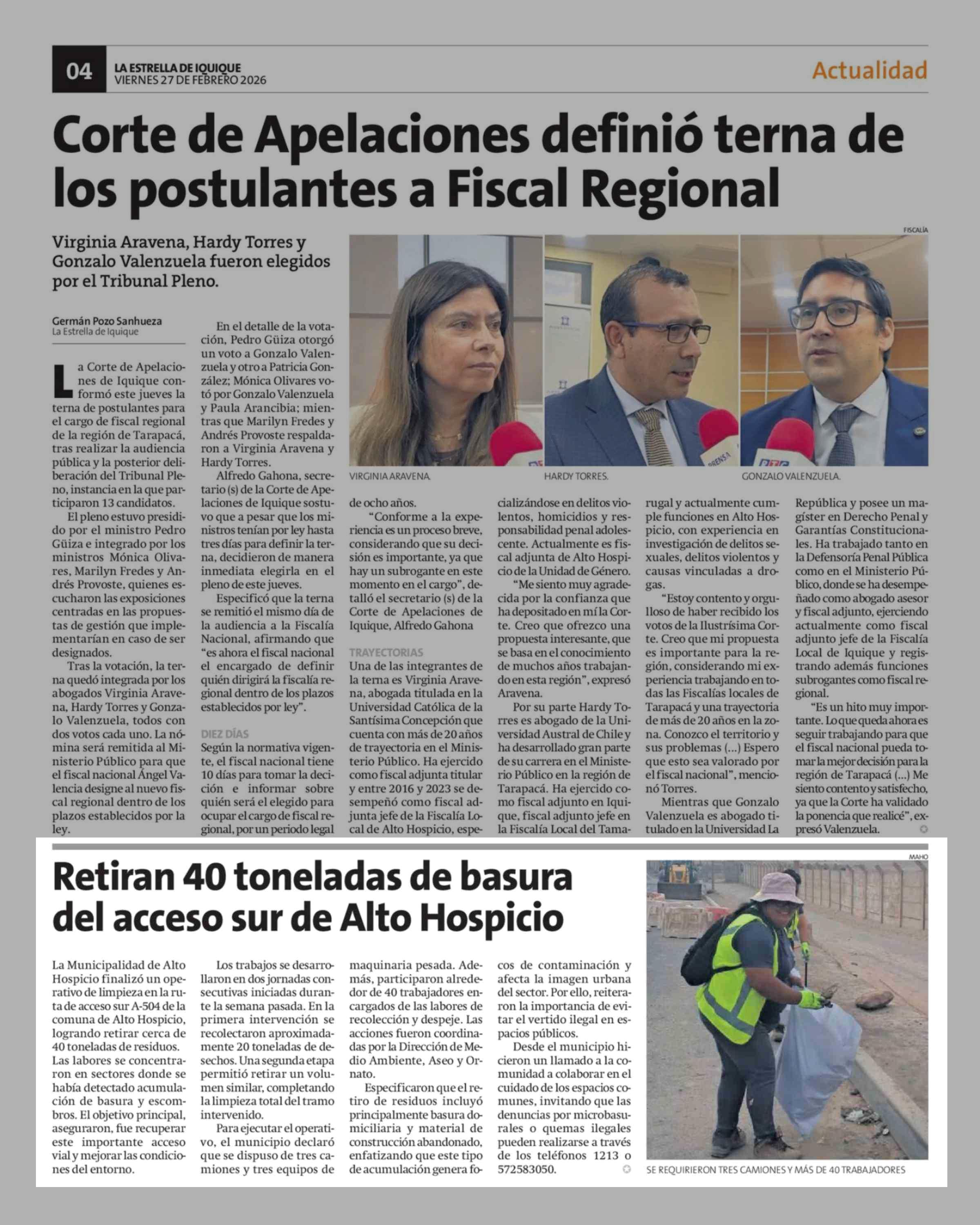 Retiran 40 toneladas de basura del acceso sur de Alto Hospicio 27-02-2026 La Estrella de Iquique |