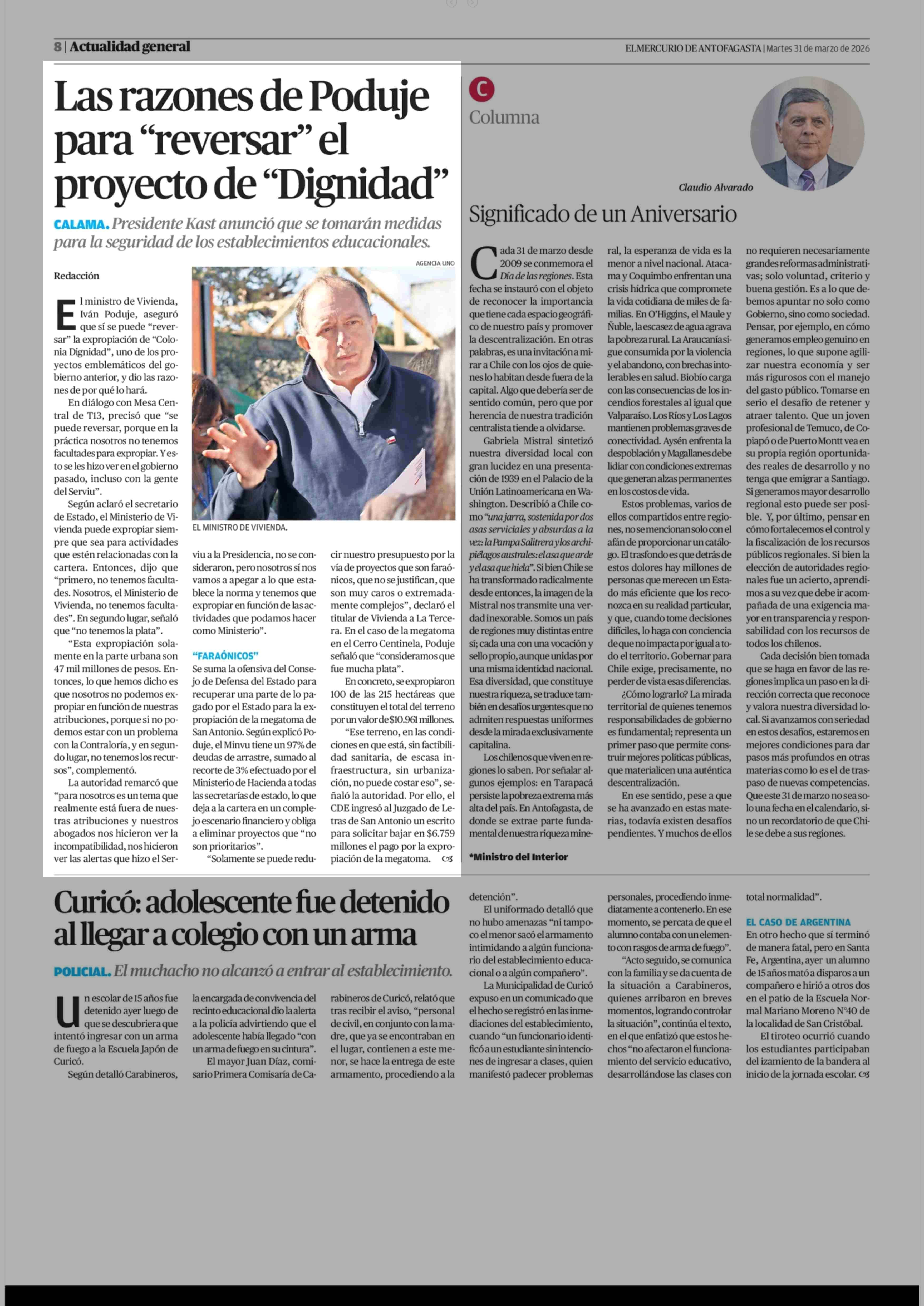 Las razones de Poduje para “reversar” el proyecto de “Dignidad” 31-03-2026 El Mercurio de Antofagasta |