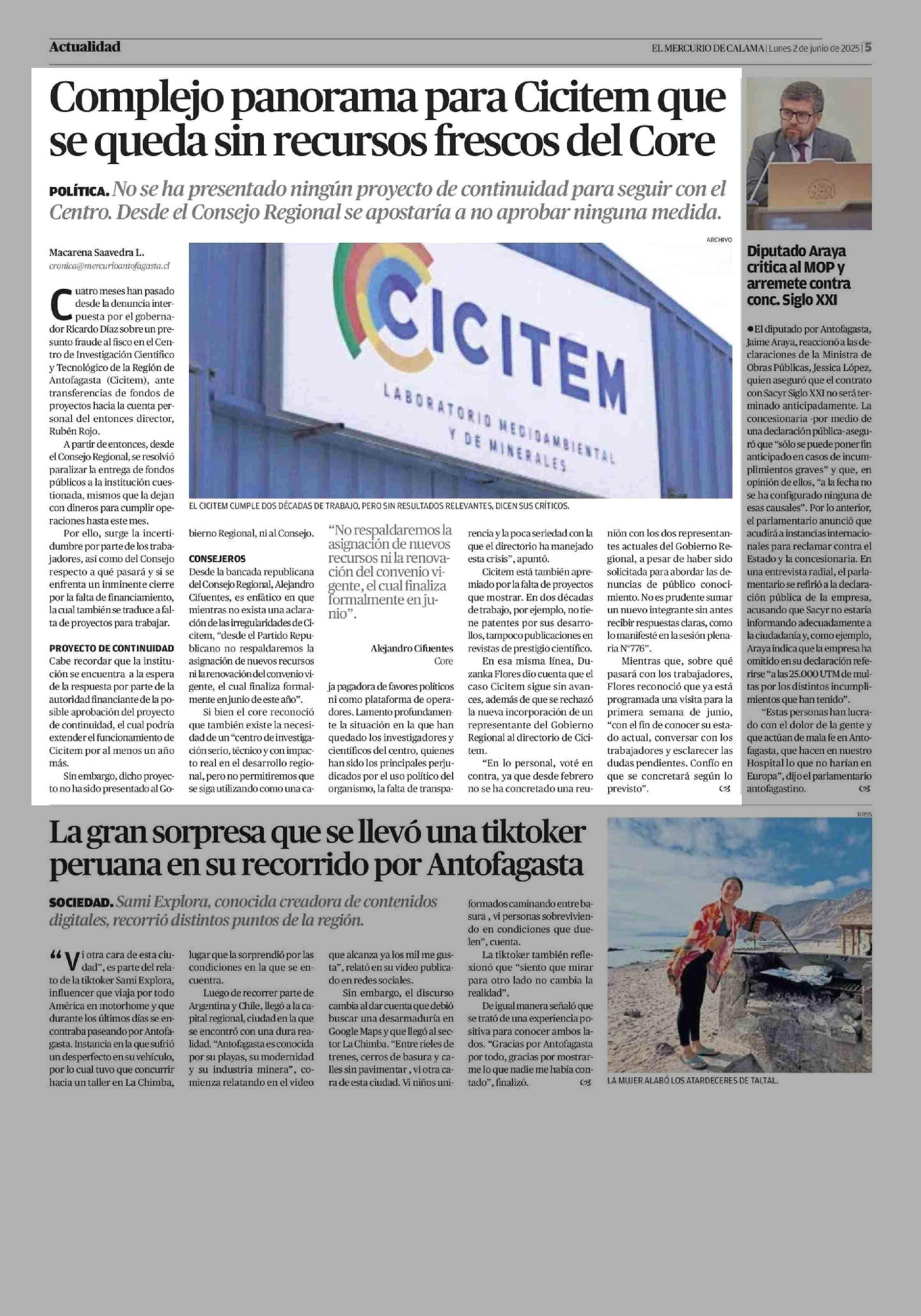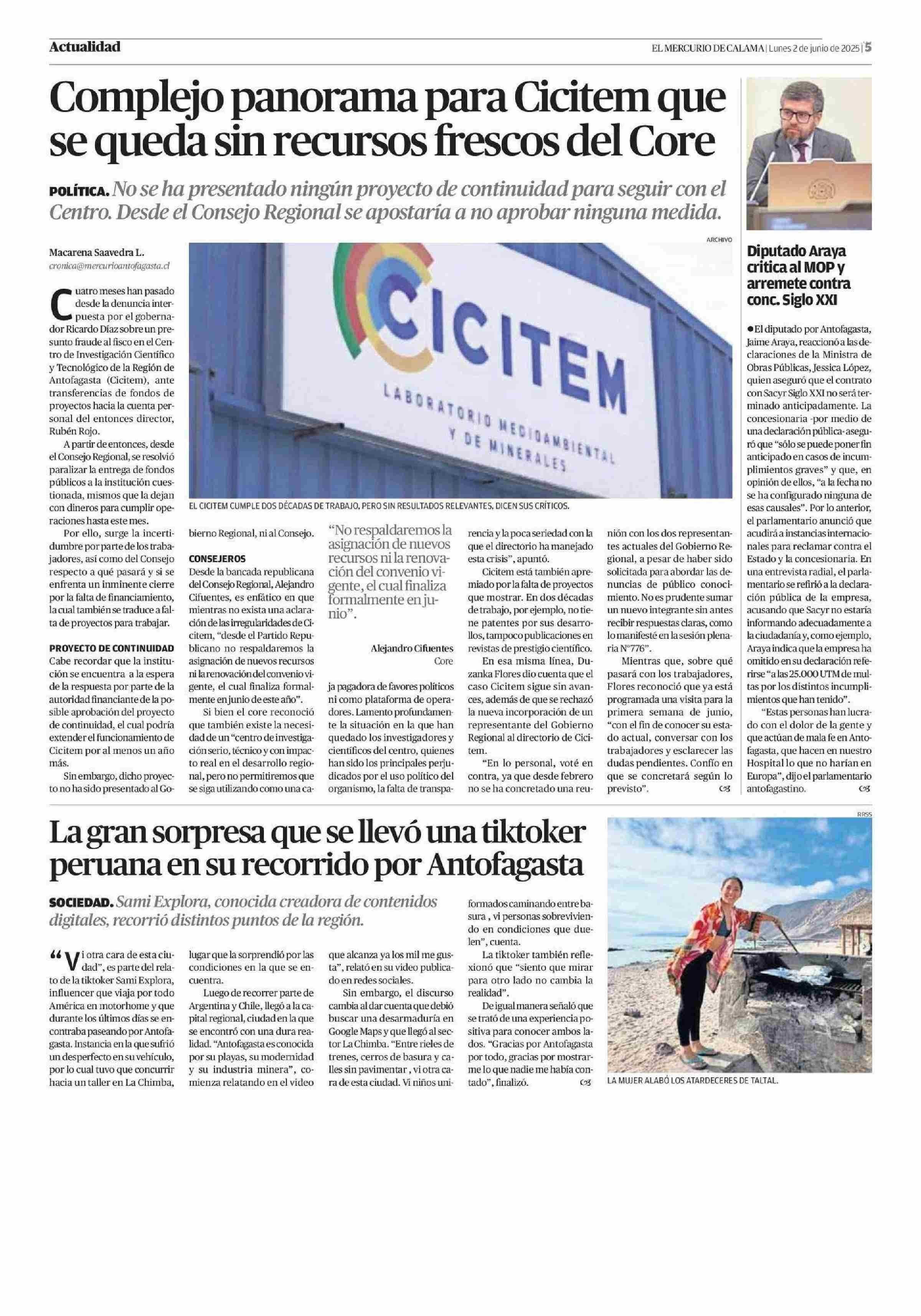 Complejo panorama para Cicitem que se queda sin recursos frescos del Core 02-06-2025 El Mercurio de Calama |
